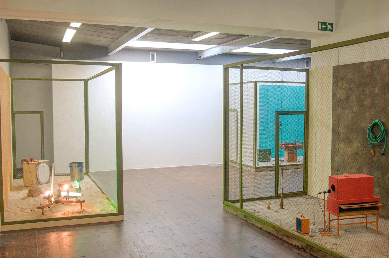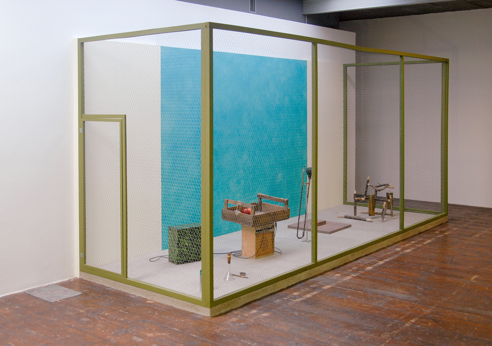 Bij Stroom is op dit moment een solo-presentatie te zien van Gareth Moore (1975). En hij doet in zijn werk eigenlijk het tegenovergestelde van dat computerspel. Hij roept zoveel mogelijk verschillende informatie op, associaties en daarmee verward hij de toeschouwer. Hij toont een zestal kooien, gelijk van formaat maar steeds met een ander gaas, andere achterwand en andere bodem. De materialen zijn soms logisch zoals zand, maar rattengif (hoe mooi de kleur blauw ook is) is geen gebruikelijk pigment materiaal.