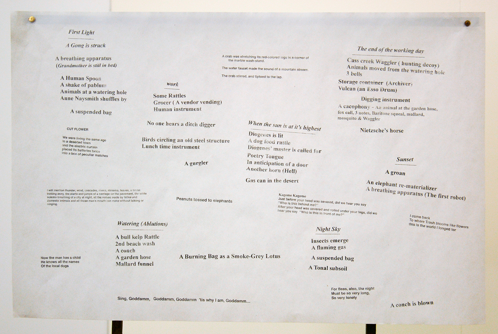Gareth Moore – A Burning Bag as a Smoke-Grey Lotus (Roll on roofing, Leaves, Human Instrument, Poetry Tongue, Bull Kelp Rattle, Diogenes Master, Transformer (Rhododendron), Mallet) – Installatie