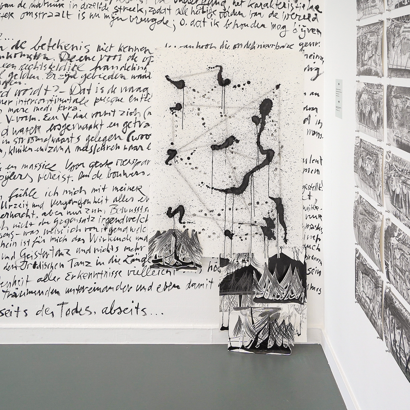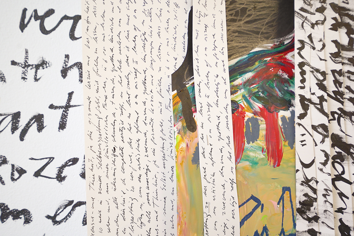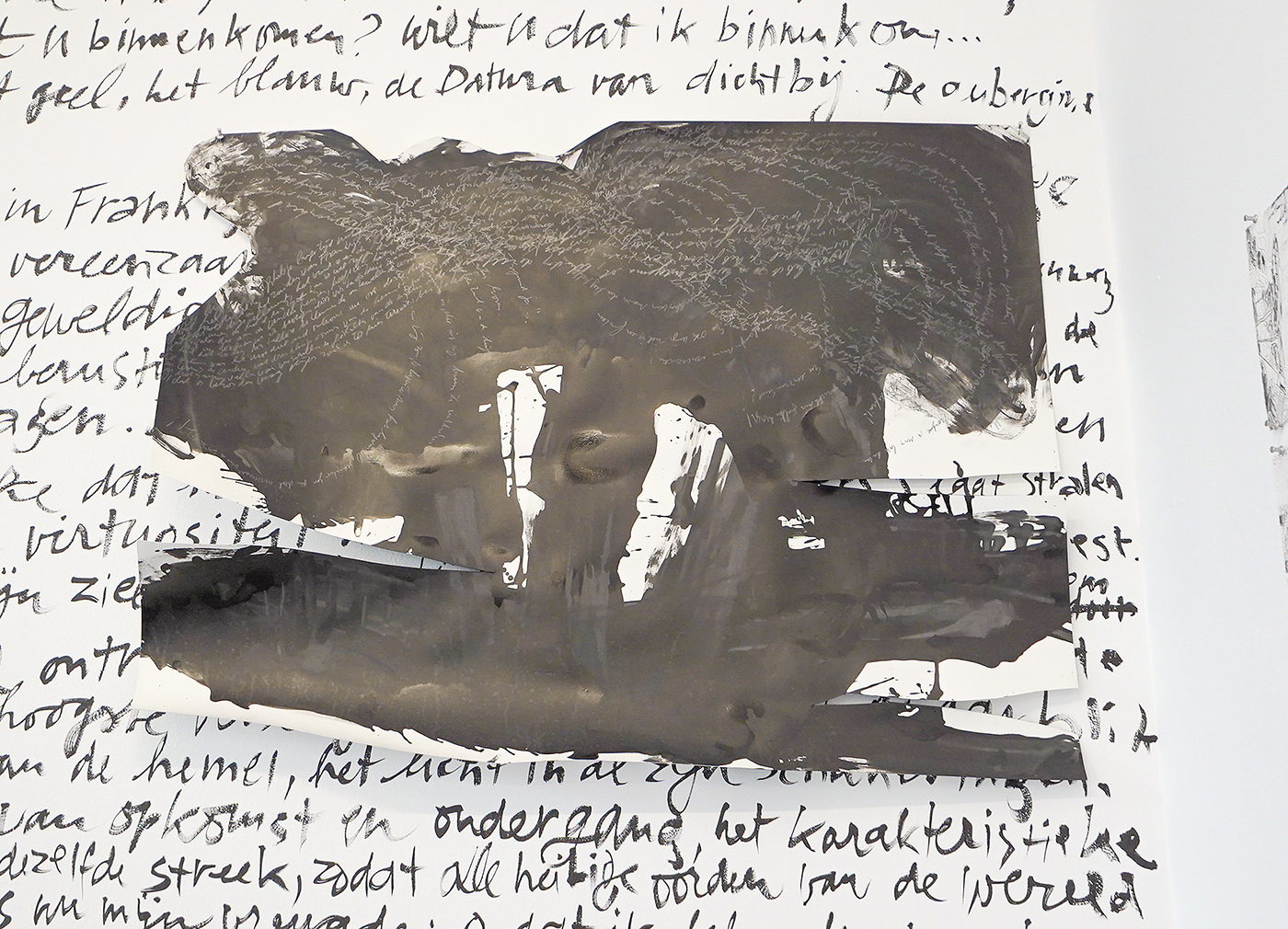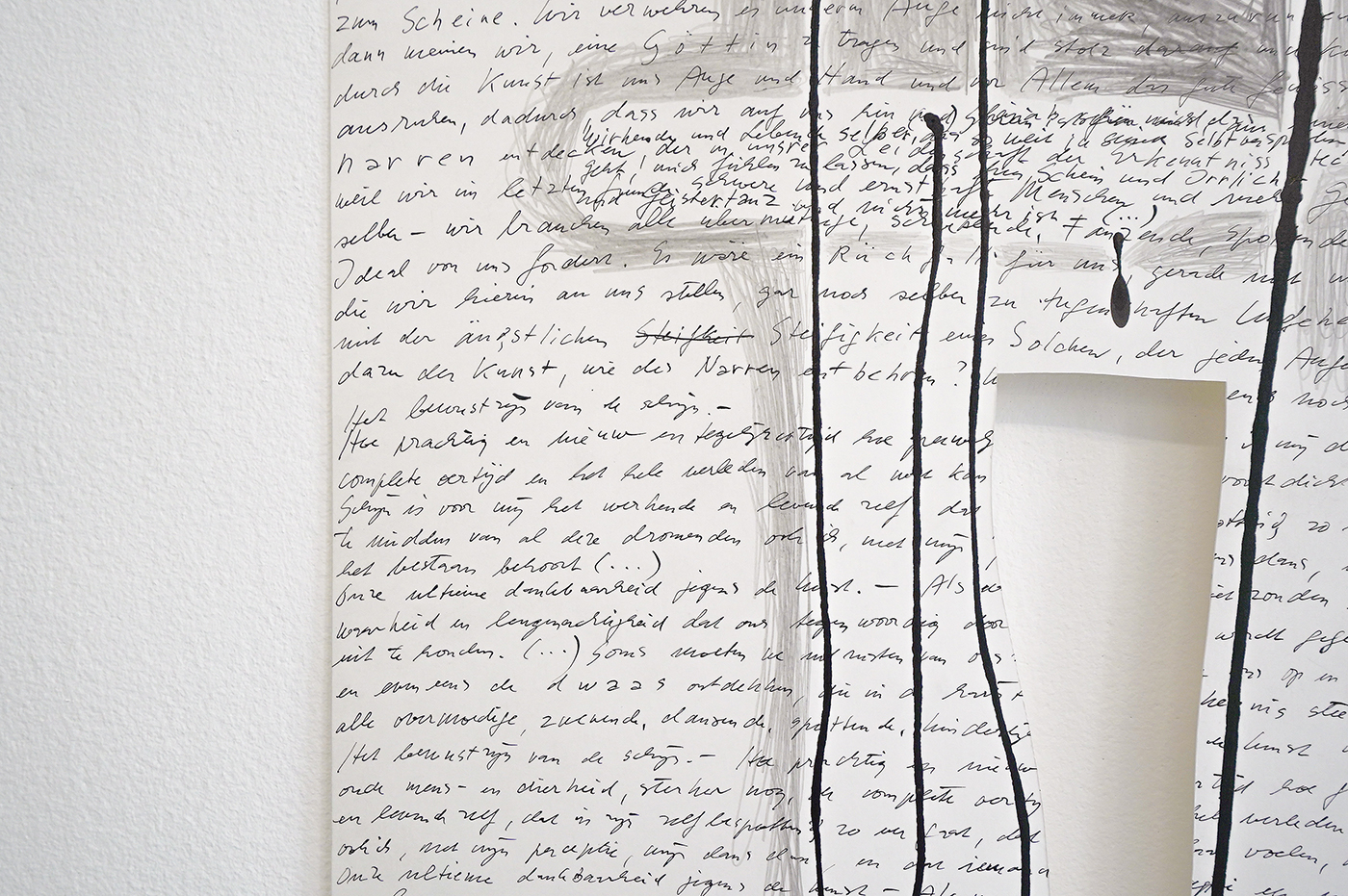 Het werk van Marjolijn van den Assem (1947) is intens. Al jaren lang werkt ze vanuit het gedachtengoed van de filosoof Nietzsche. Ze herschrijft hele boeken van de denker. Soms leesbaar, maar vaker niet en verandert de tekst naar beeld. Vrijwel altijd geschreven met inkt op papier, soms met een fijne pen, dan weer met een kwast. Soms wordt er in gesneden en weer aan elkaar verbonden met de nietmachine. Van megalomaan groot met grote gebaren, tot bedachtzaam schrijven en kleine collages.