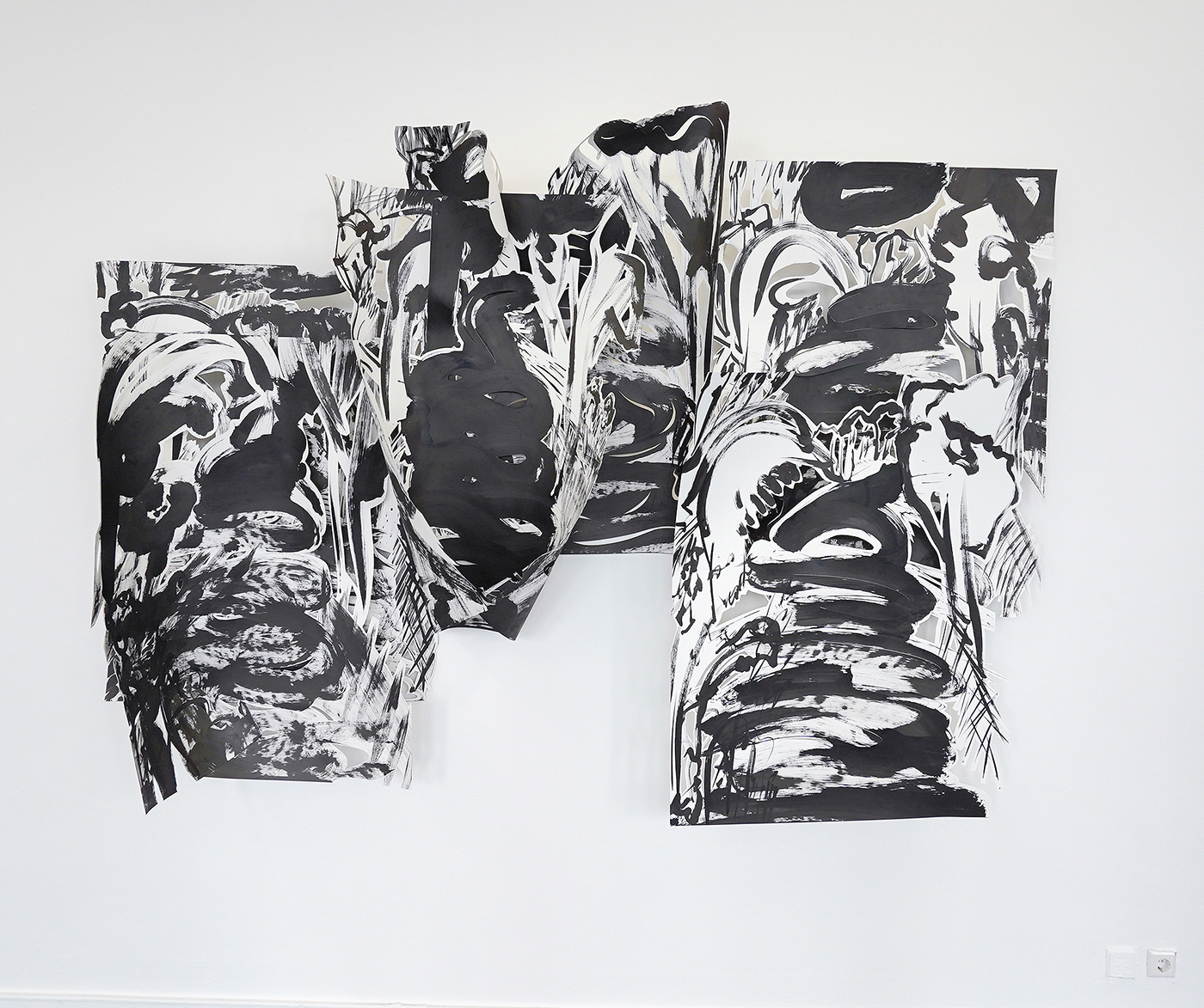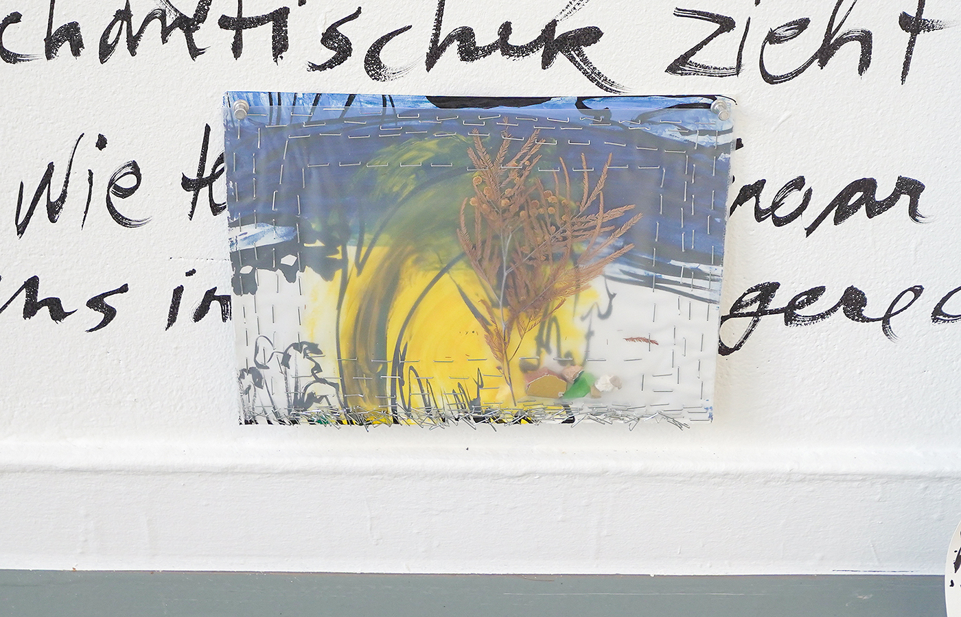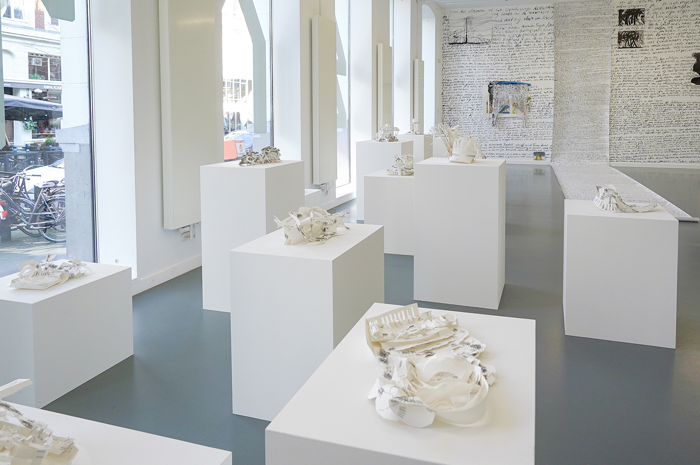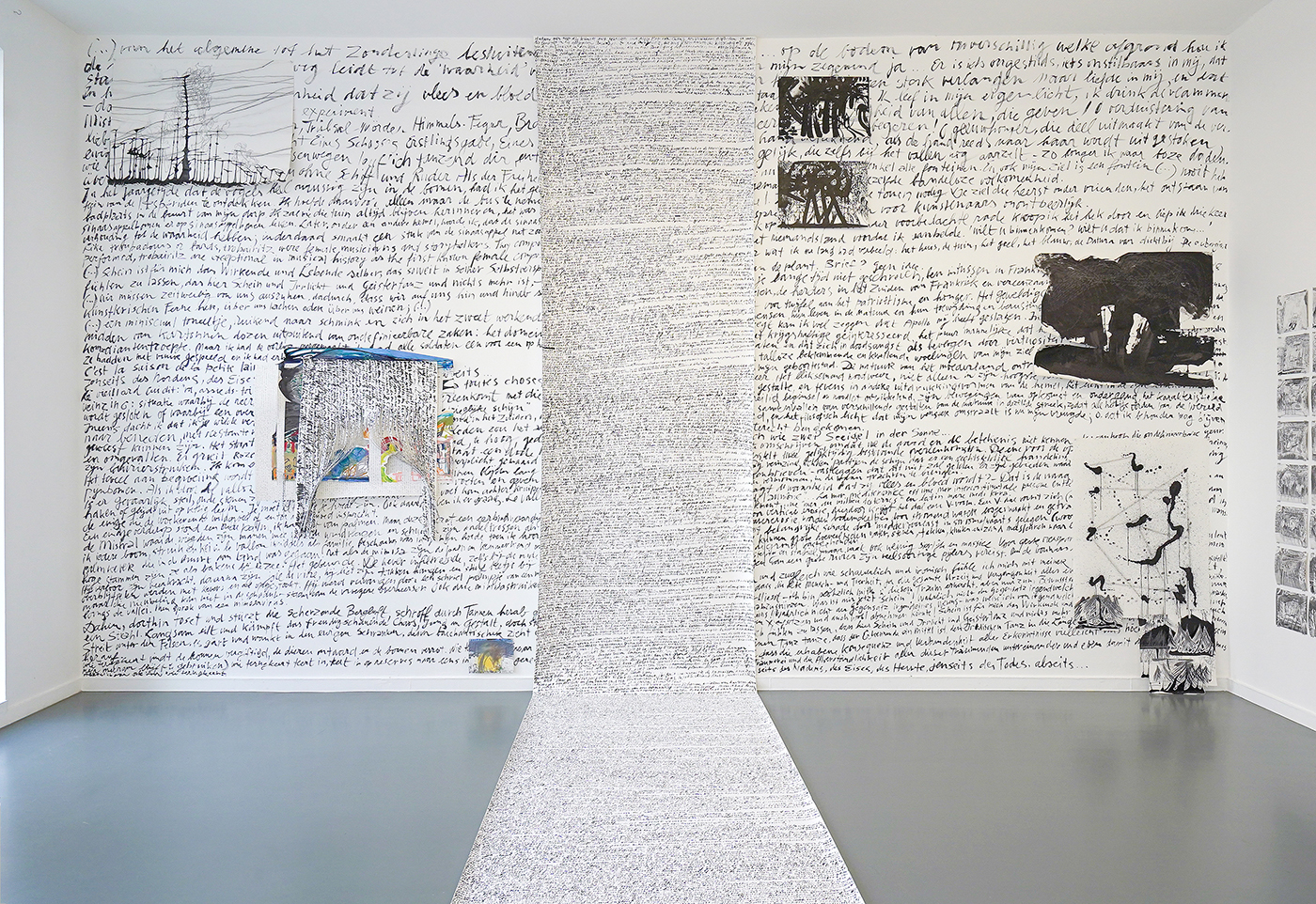 Het werk van Marjolijn van den Assem (1947) is intens. Al jaren lang werkt ze vanuit het gedachtengoed van de filosoof Nietzsche. Ze herschrijft hele boeken van de denker. Soms leesbaar, maar vaker niet en verandert de tekst naar beeld. Vrijwel altijd geschreven met inkt op papier, soms met een fijne pen, dan weer met een kwast. Soms wordt er in gesneden en weer aan elkaar verbonden met de nietmachine. Van megalomaan groot met grote gebaren, tot bedachtzaam schrijven en kleine collages.
