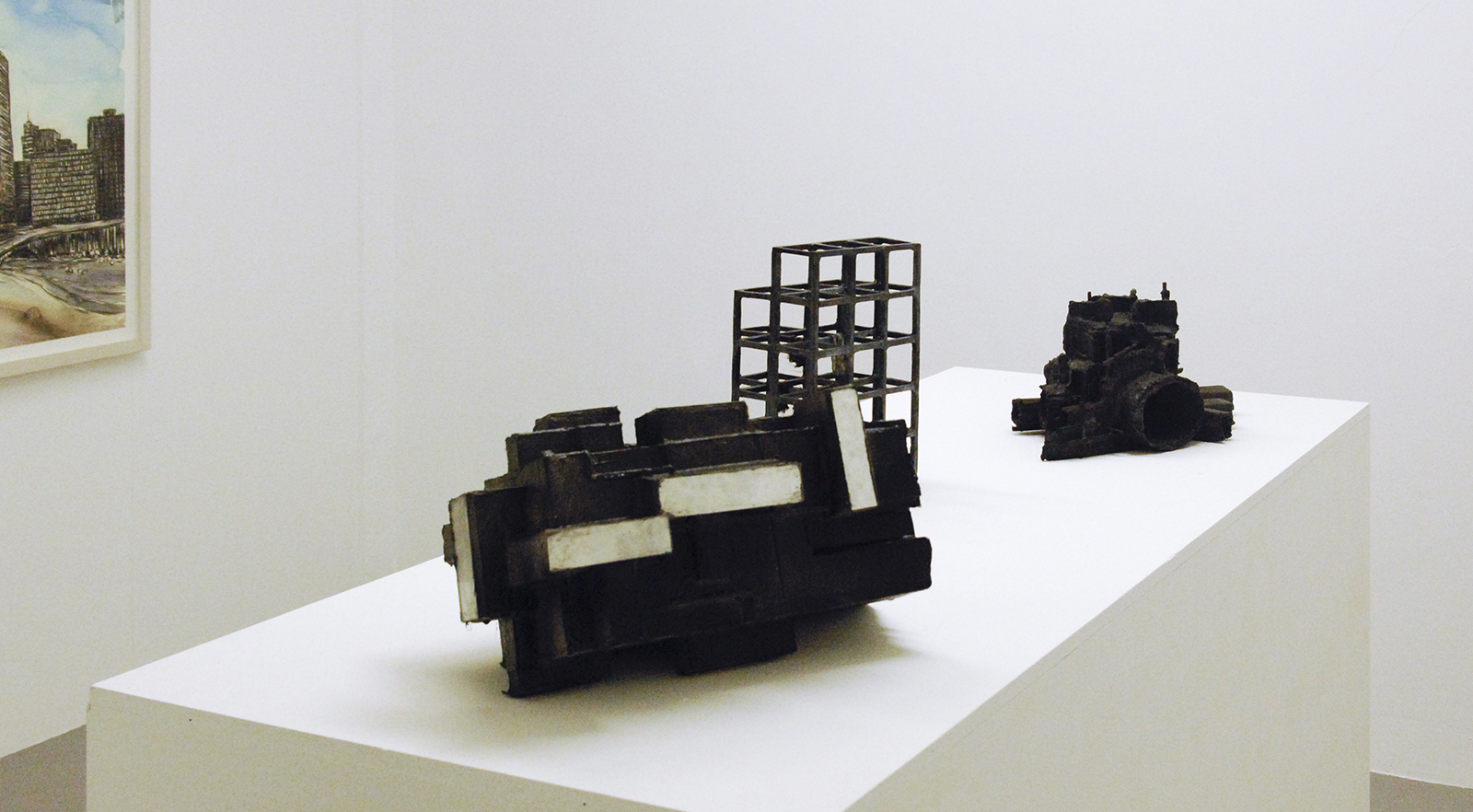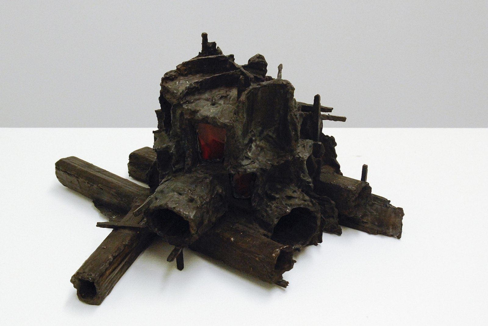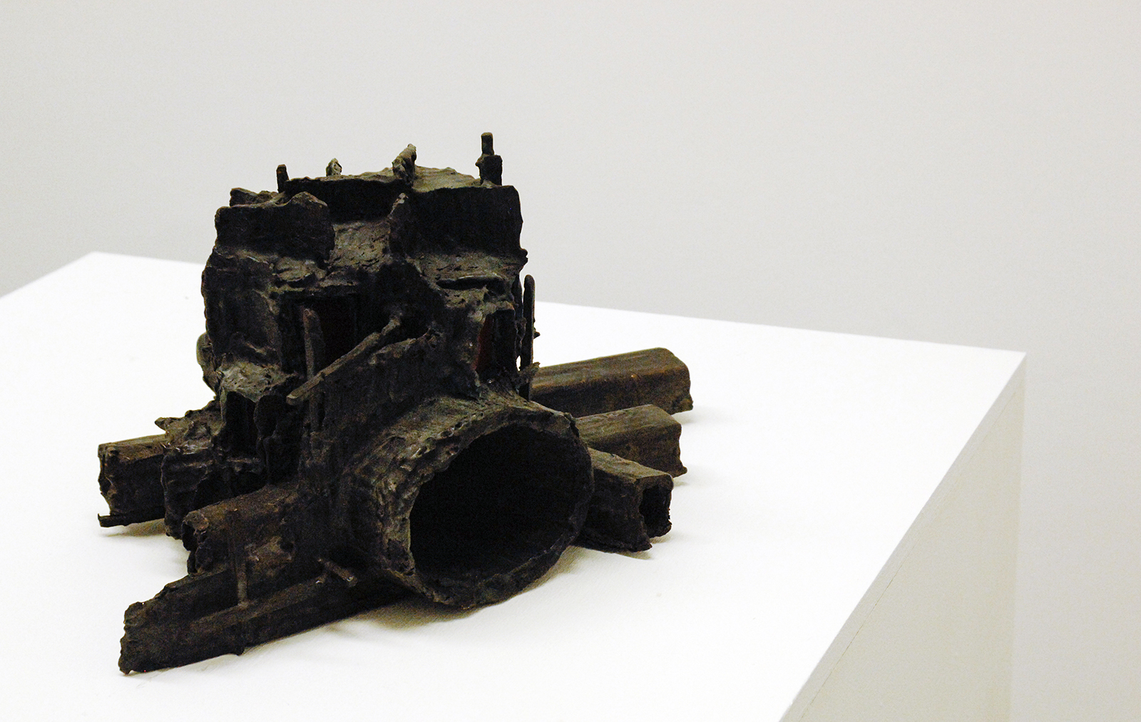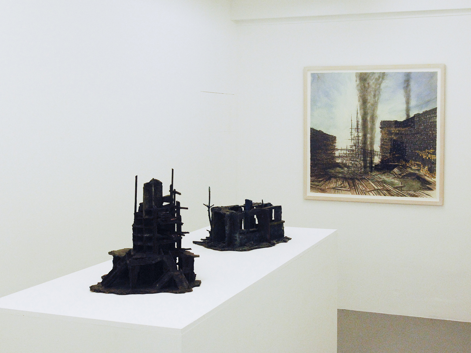 Rob Voerman – Incinerator #1 – 48x46x48cm Brons en glas & Settlement #1 – 37x29x47cm Brons en karton & Structure – 103x108cm Aquarel, potlood en roet op papier
