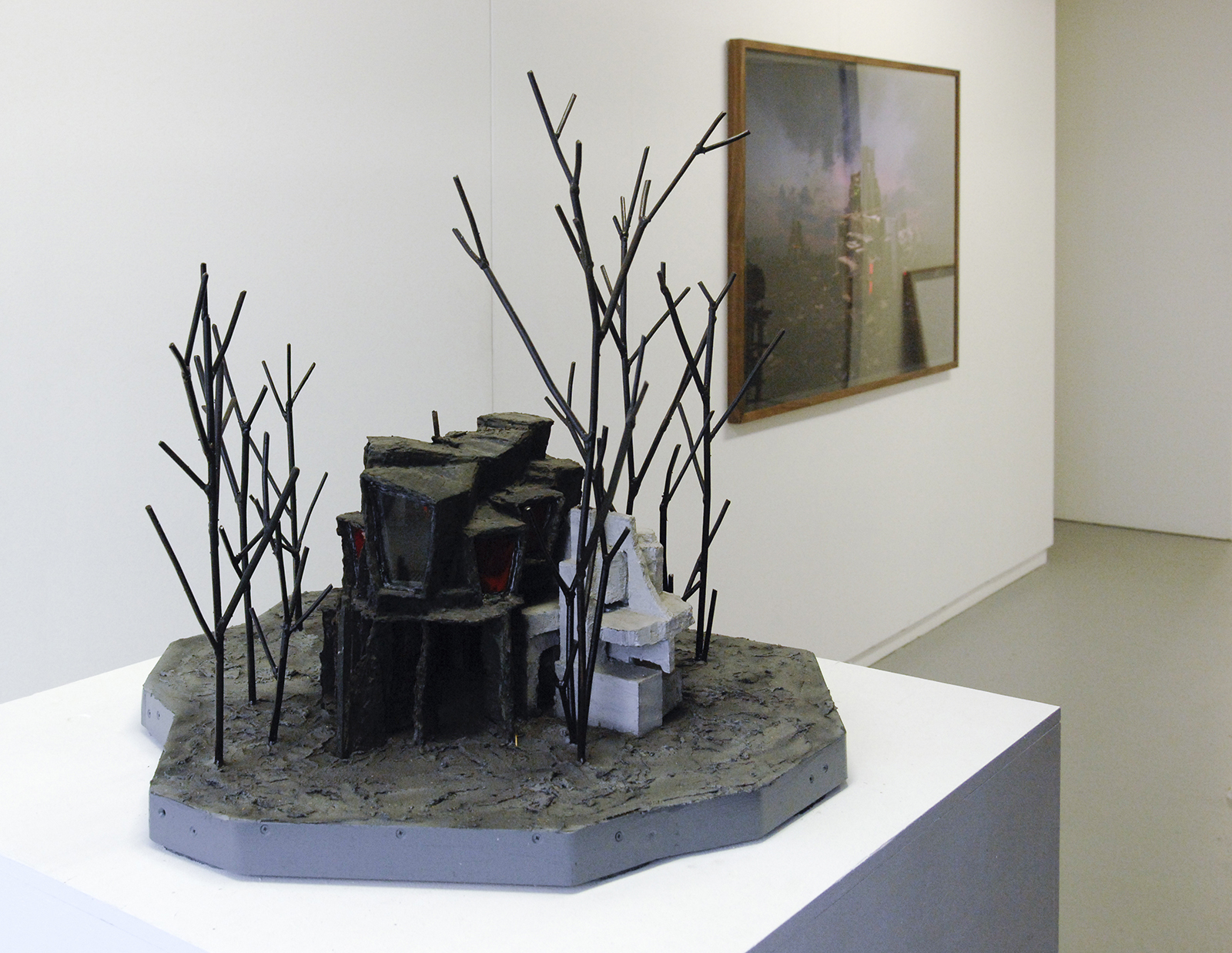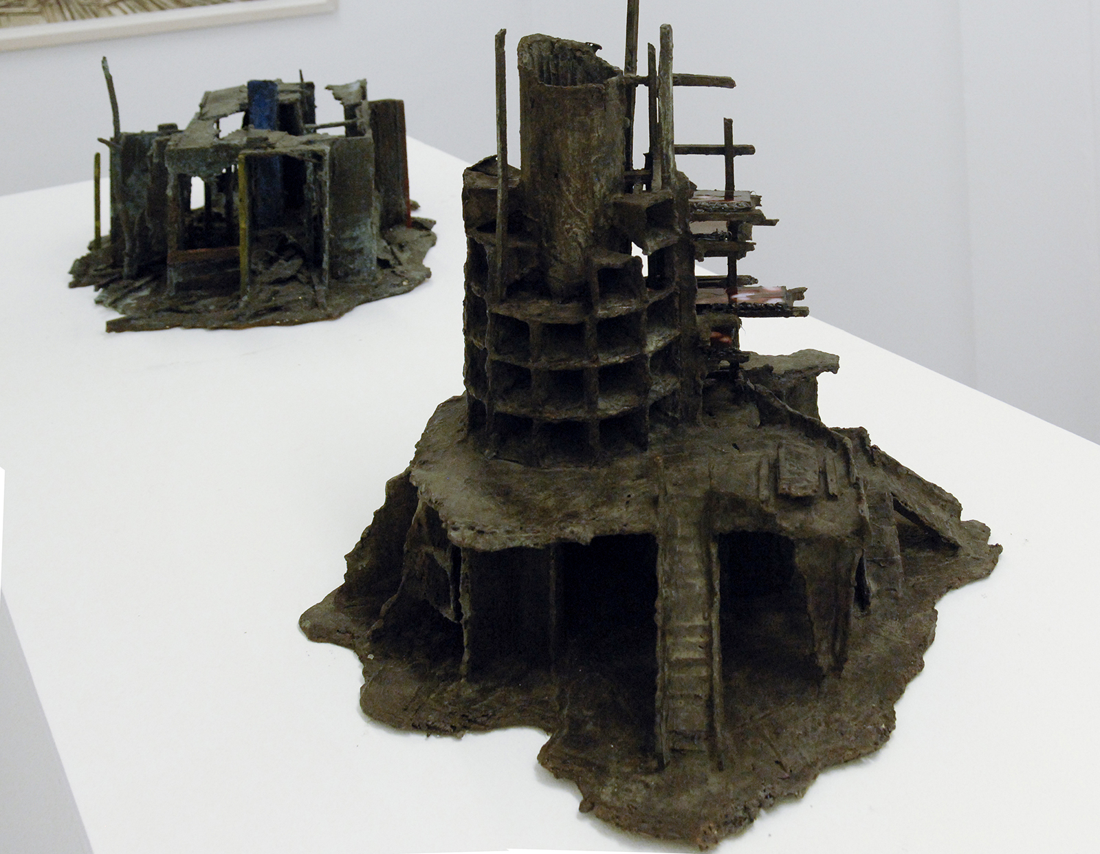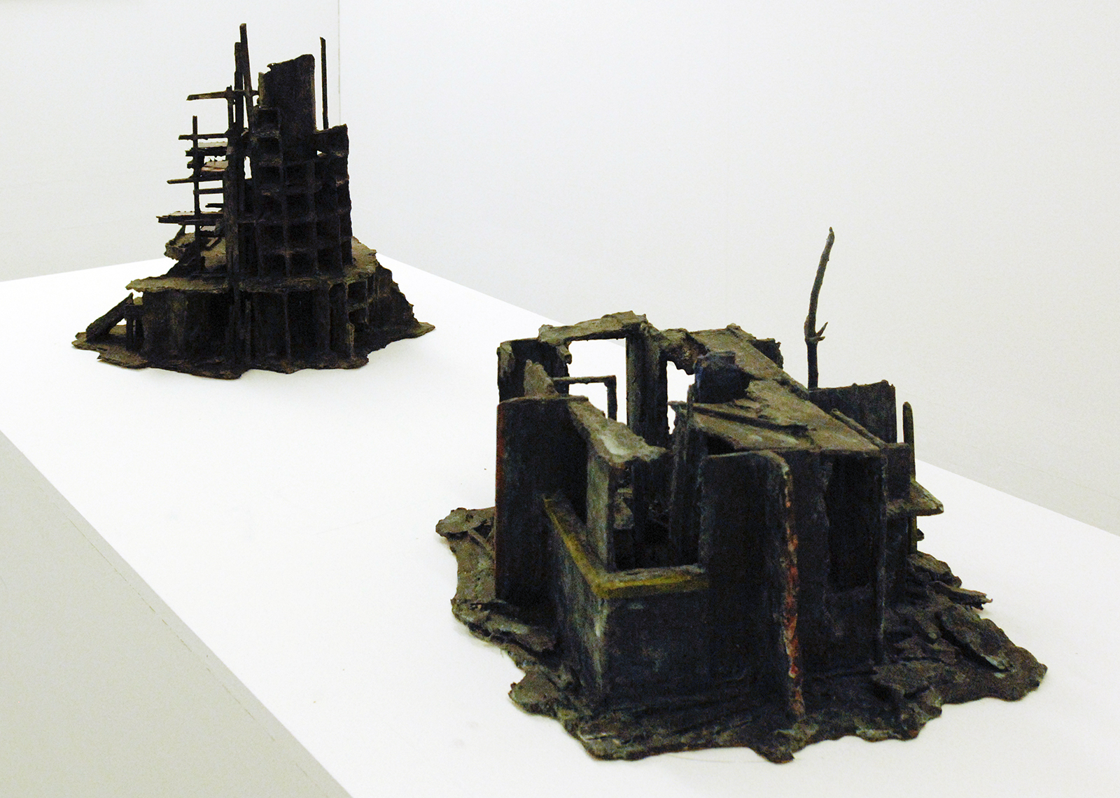 Rob Voerman – Incinerator #1 – 48x46x48cm Brons en glas & Settlement #1 – 37x29x47cm Brons en karton & Structure – 103x108cm Aquarel, potlood en roet op papier