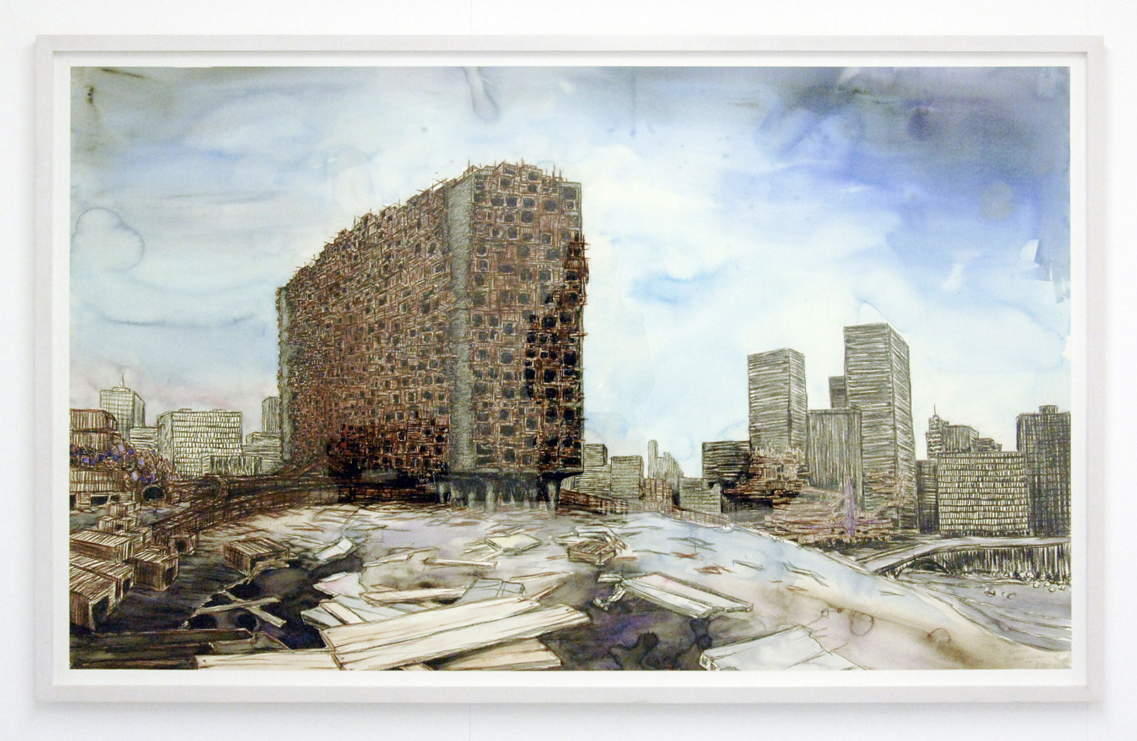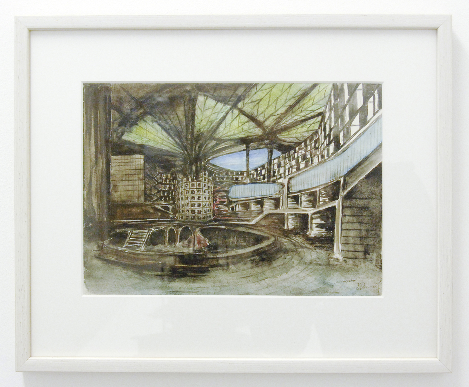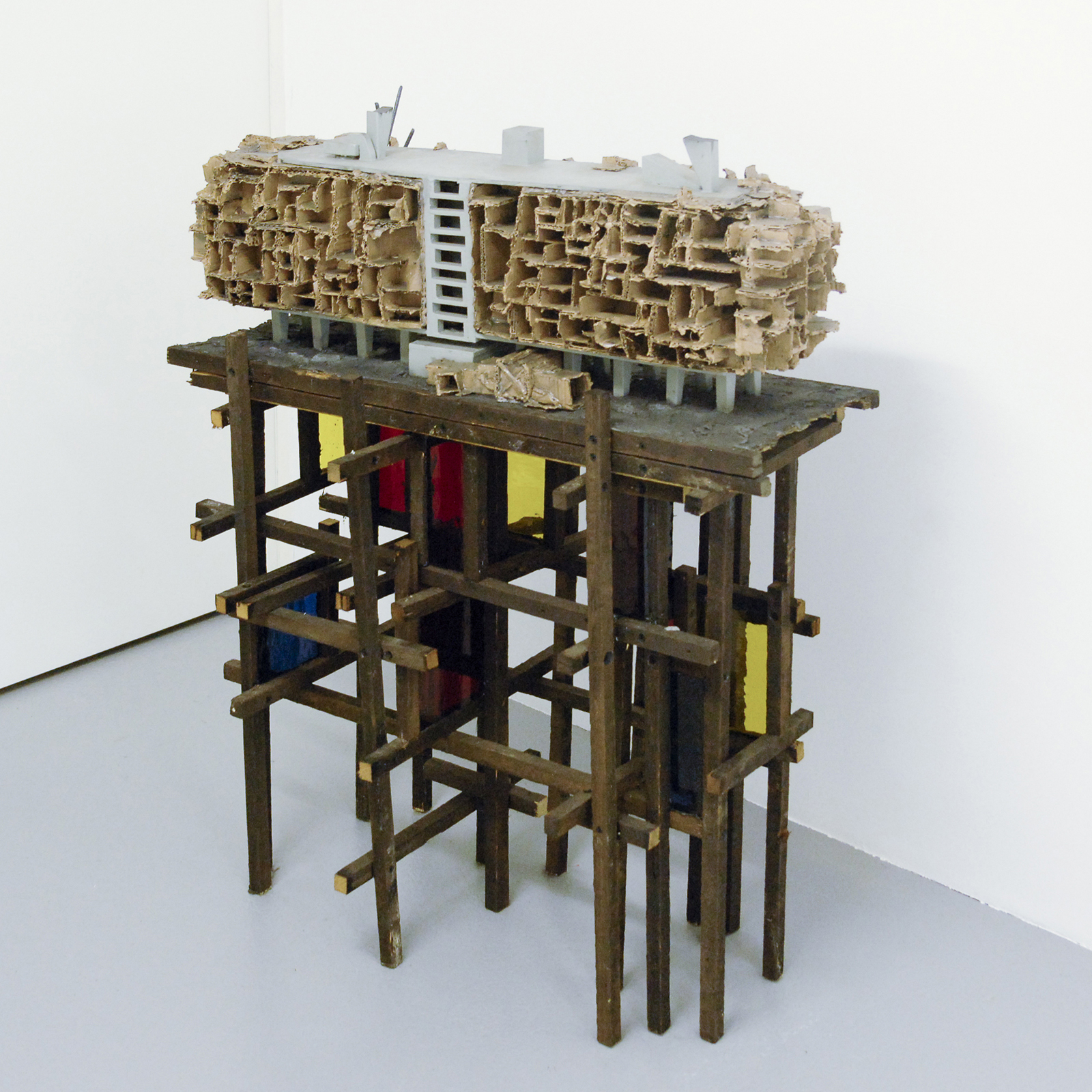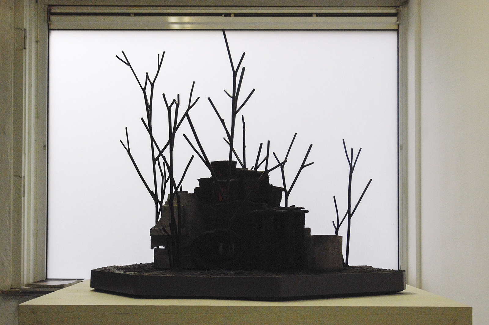 Rob Voerman – Incinerator #1 – 48x46x48cm Brons en glas & Settlement #1 – 37x29x47cm Brons en karton & Structure – 103x108cm Aquarel, potlood en roet op papier