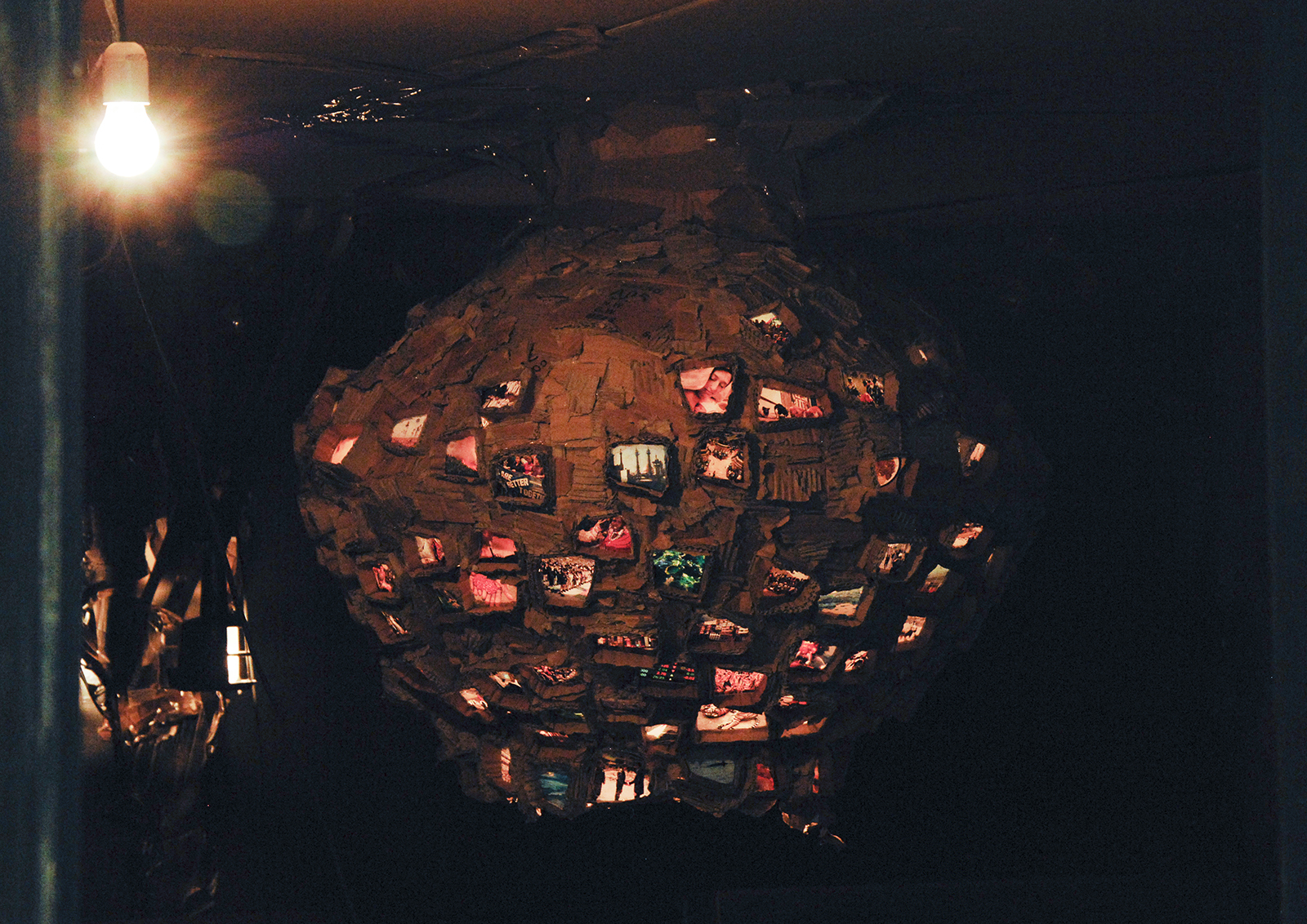 Bij binnenkomst verbaasde me het nogal, normaal ziet een galerie er leeg uit. Dan hangen er schilderijen of foto’s aan de witte wanden en als het druk is loopt er nog iemand in de galerie te kijken. In sommige gevallen is het een formele conceptuele installatie waarbij het verduisterd is om de diaprojecties zichtbaar te maken. Maar hoevaak tref je nu een hele gezellige knutselclub aan in een sociale ruimte gemaakt door de kunstenaar, een ‘hok’ wat van belicht wordt met een gigantische kartonnen lamp met daarop foto’s. Afijn, dat is even schrikken als je binnen komt maar zegt ook direct waar het werk van Rob Voerman (1966) voor staat. Voerman heeft nog het geloof in een utopie.