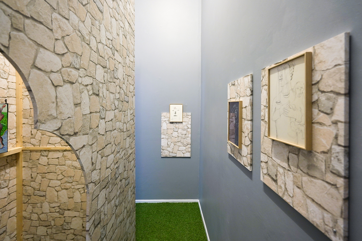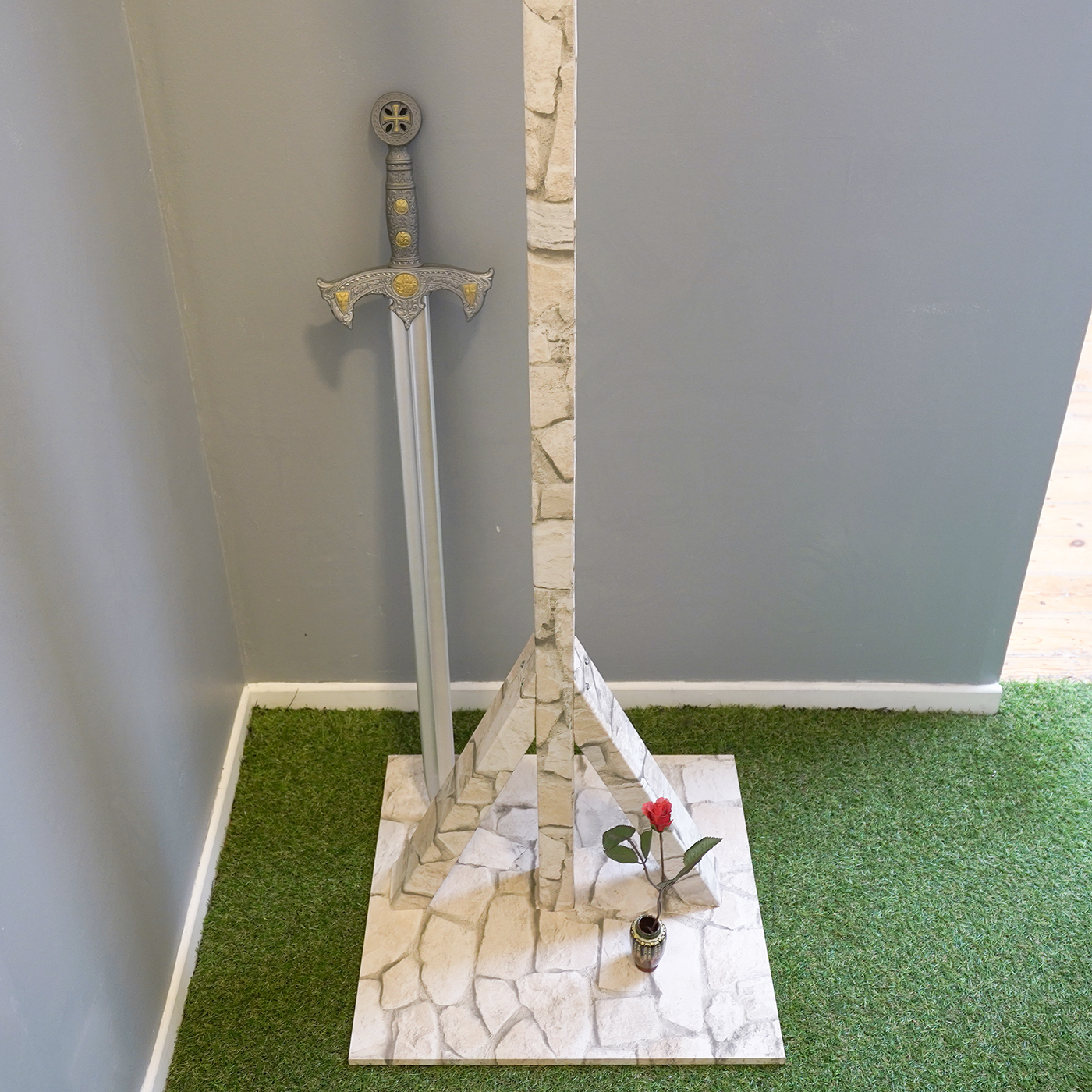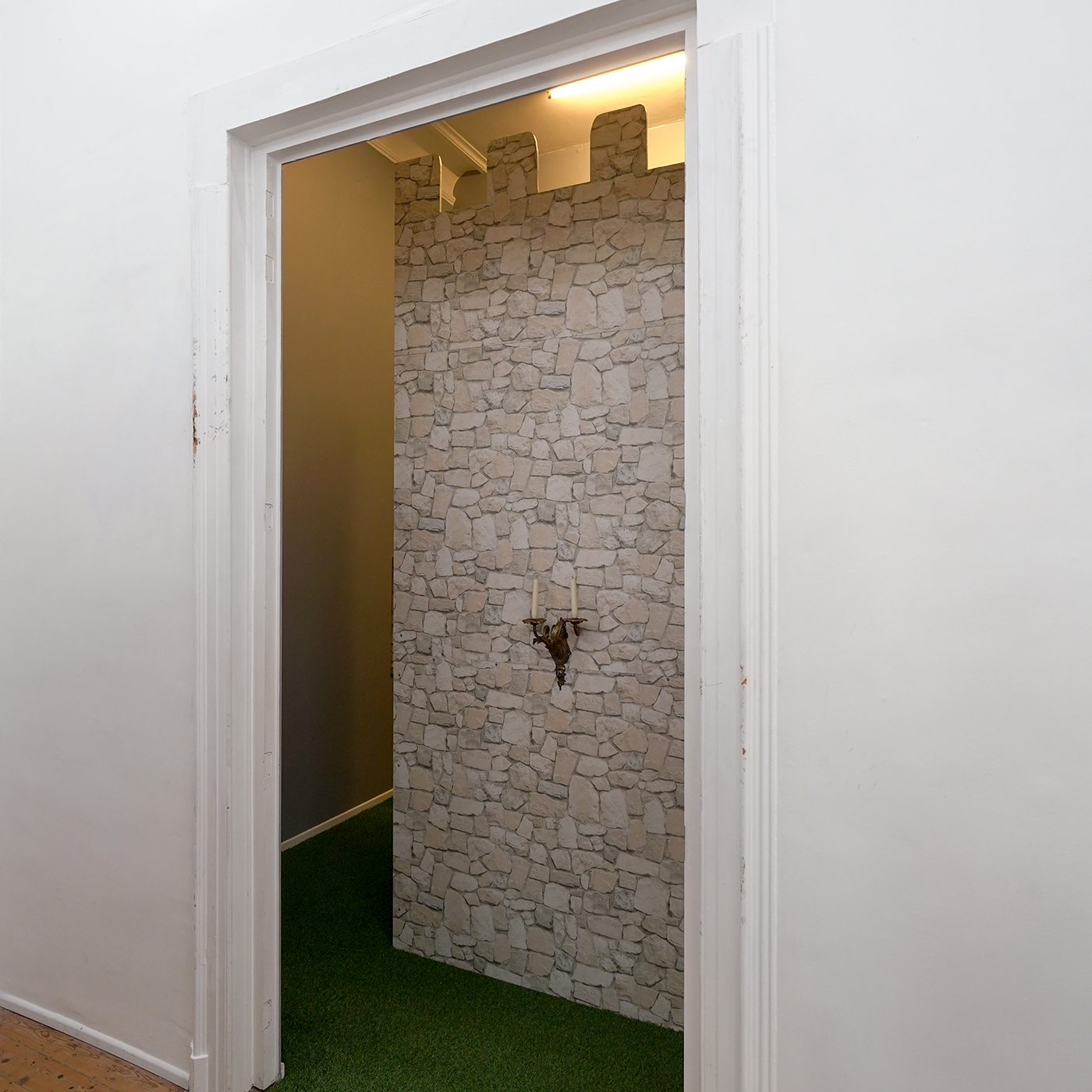 De vloer is veranderd in kunstgras, de wanden zijn grijs geschilderd met daarop kapitelen gemaakt met behang dat oude kasteelmuren doet vermoeden. Het hoogtepunt is echter het bouwsel in het midden van de kleine ruimte dat doet denken aan een kasteeltoren.