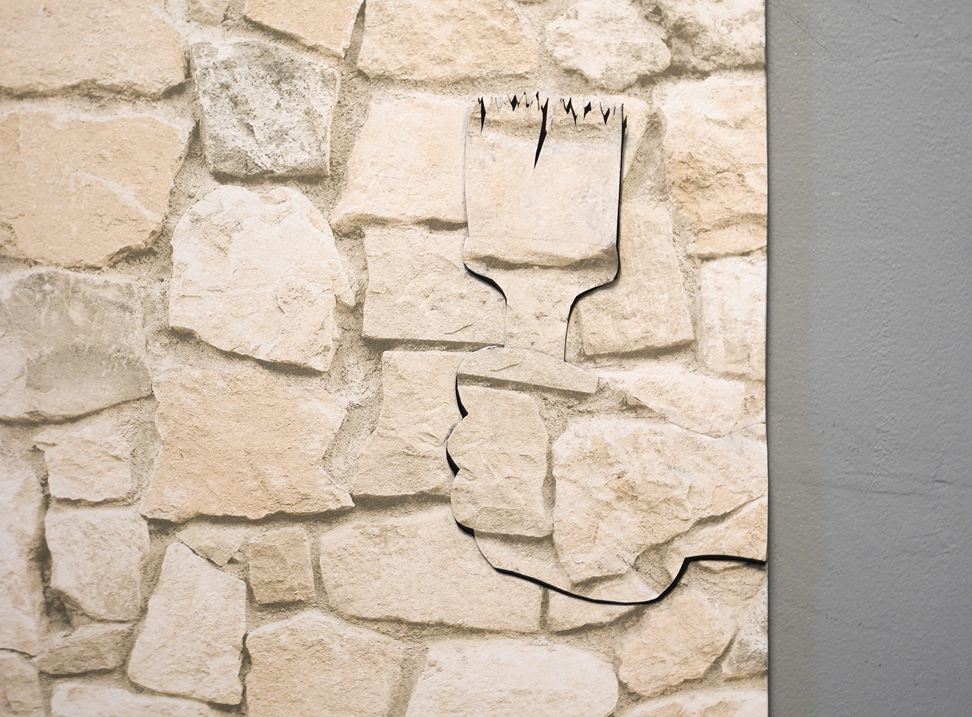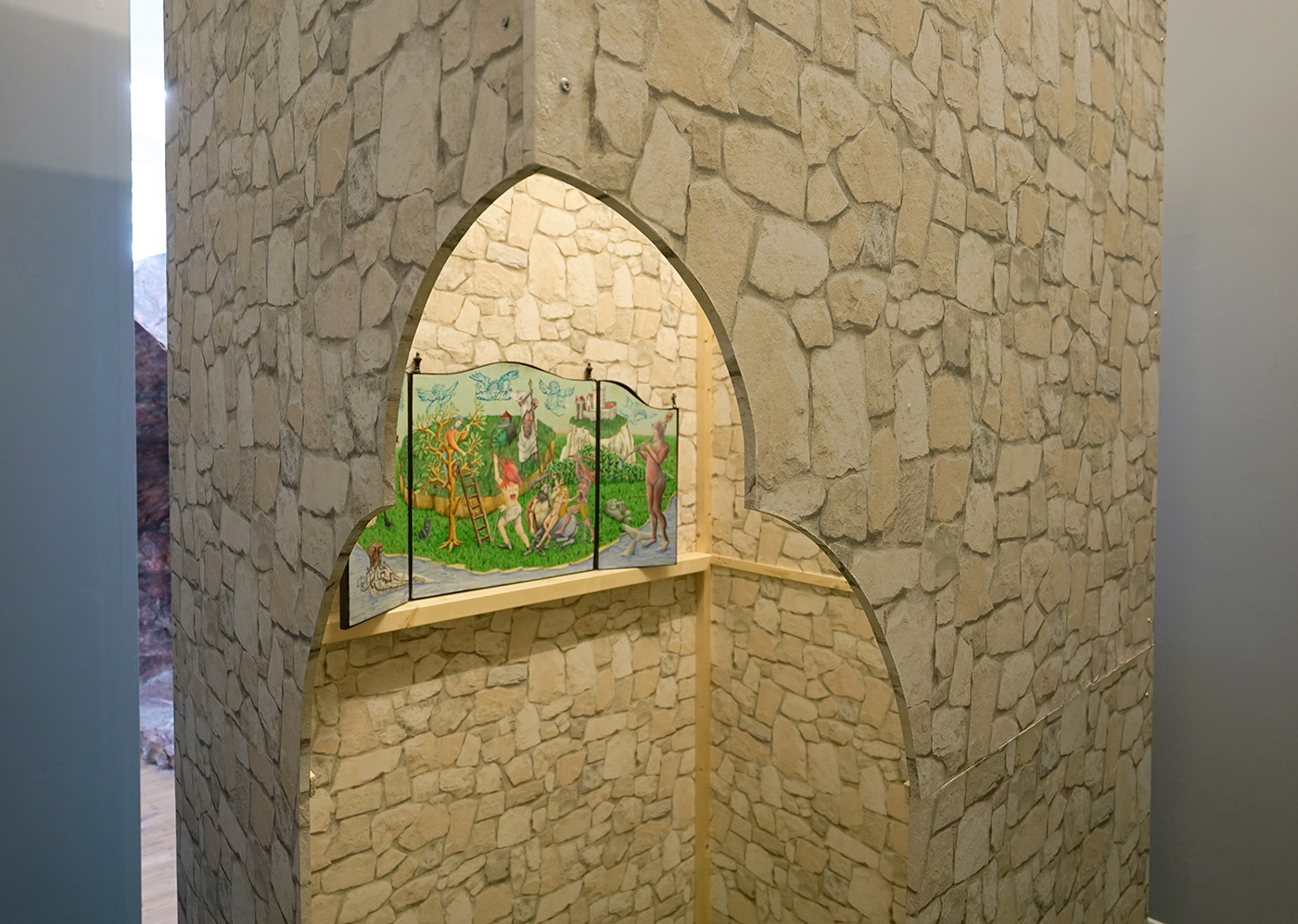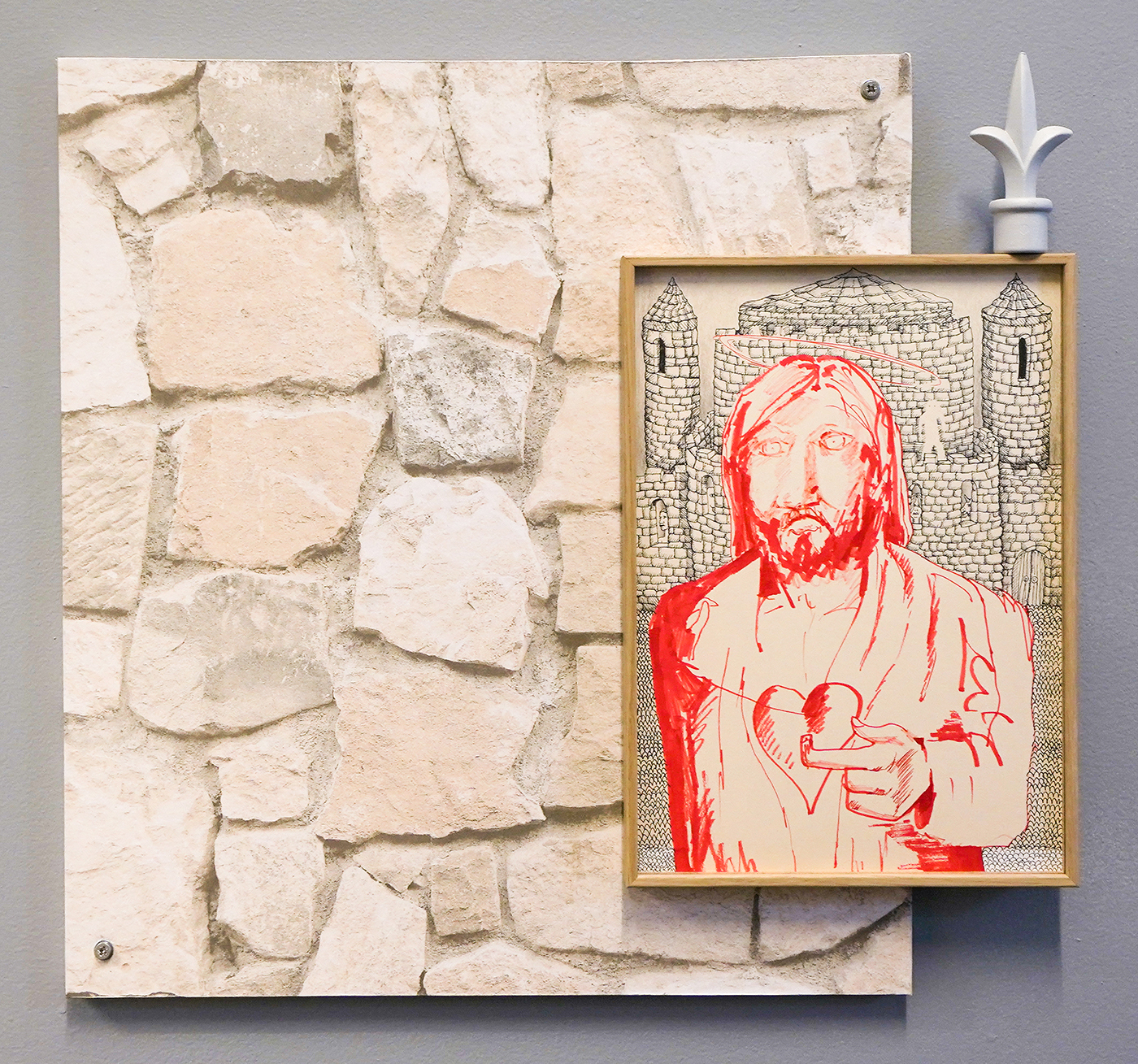 Het werk dat Poelmans er vervolgens toont past formeel gezien goed bij de installatie. Nergens wekt zijn kasteeltoren de indruk daadwerkelijk een kasteeltoren te zijn, het blijft een gekunsteld ding. Zijn schilderijen en tekeningen zijn in zekere zin even zo goed gekunsteld. Het had een Middeleeuws drieluik kunnen zijn maar is dat overduidelijk niet. Het had een ikoon kunnen zijn maar is overduidelijk een hedendaagse interpretatie van die beeldtaal. Het toont daarmee het verschil van toen met nu aan. Het werk van Poelmans gaat niet zo zeer over ridders en jonkvrouwen of Christelijke drieluiken, maar over de traditie van schilderkunst en zijn plek daarin. Als een kunstenaar die ten strijde trekt met zijn penseel in plaats van een zwaard.