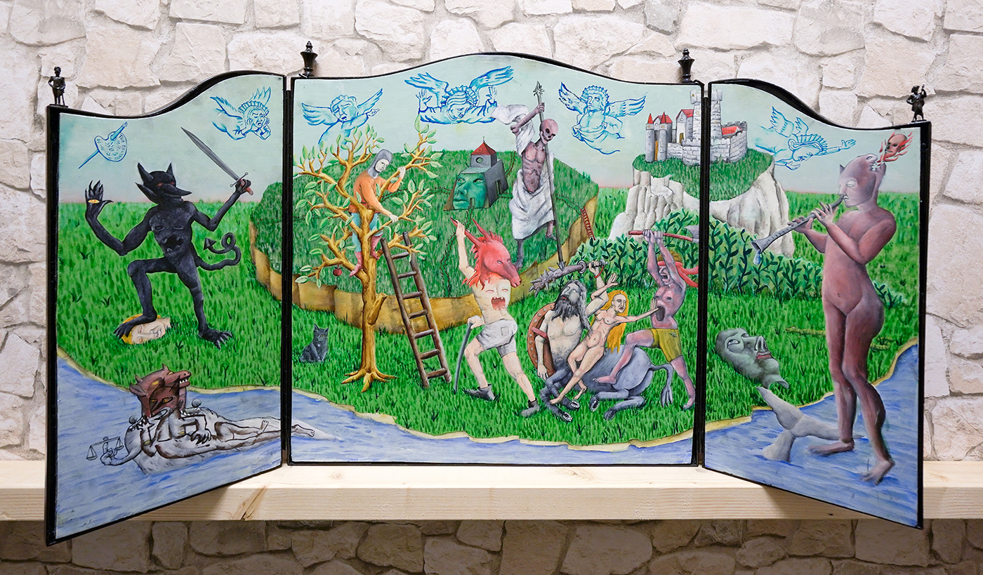 Tom Poelmans – White Whale Triptych – 57x94x19cm (open), Olieverf op paneel in metalen raamwerk (open)