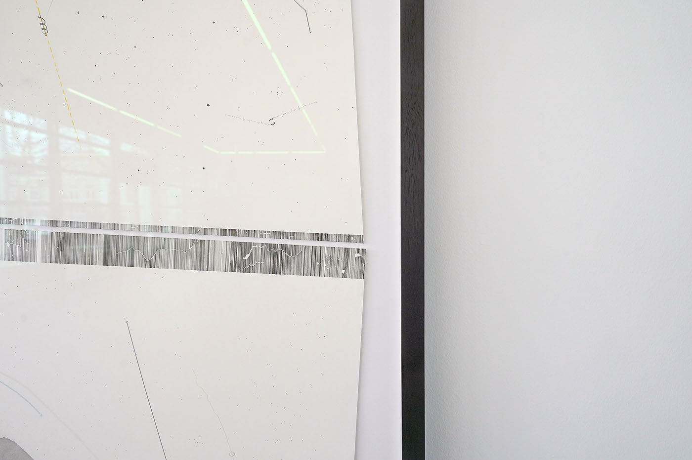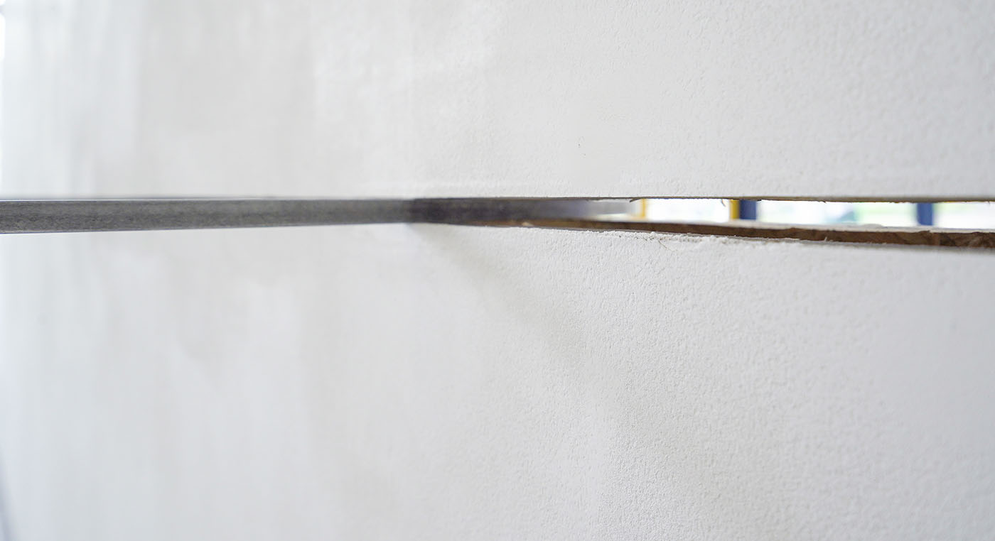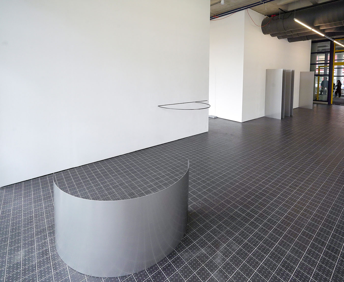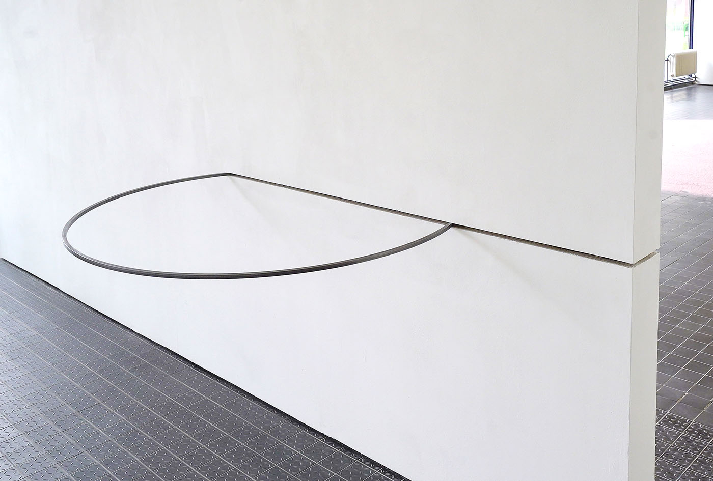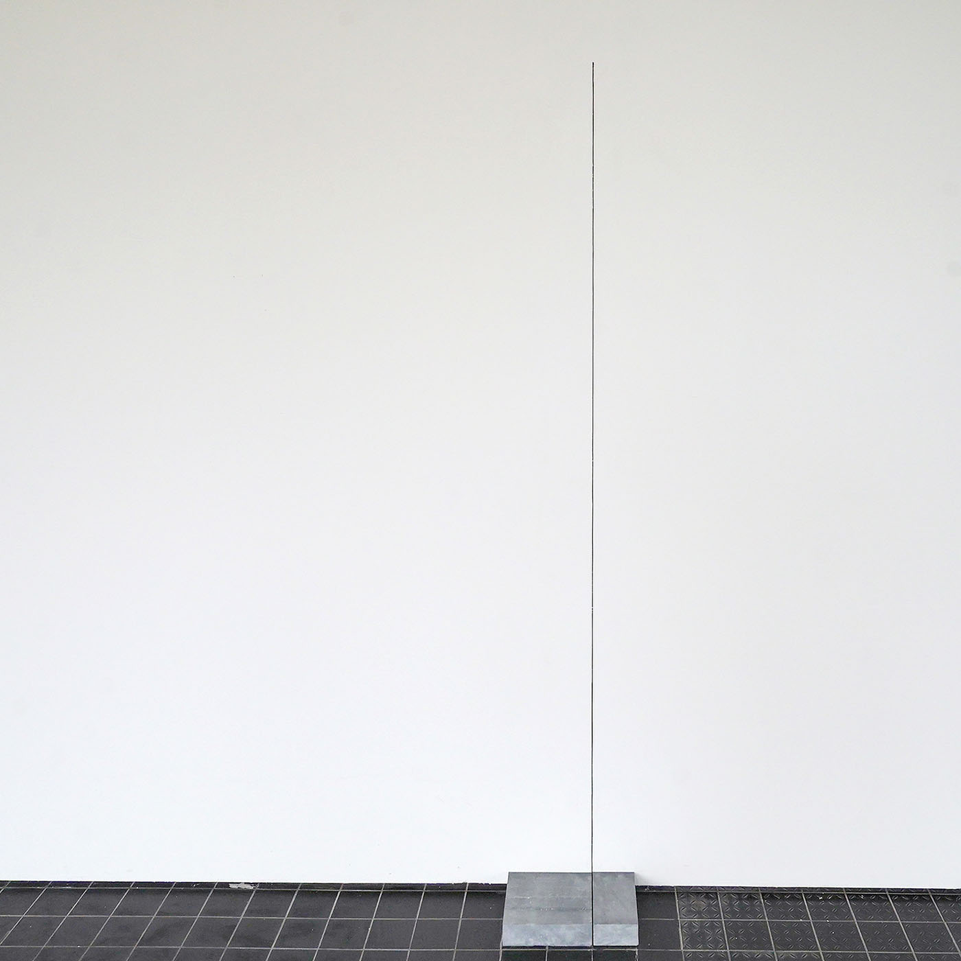 Het werk van Drčar is het meest heldere voorbeeld. Een stalen cirkel boort zich daar een weg door een muur, waarvan een reststuk nu lijkt te zweven. Een paar meter verderop staat een stalen plaat rechtop in dezelfde vorm. Alsof de stalen cirkel daar vandaan is gekomen en zo de muur vond. Het reageert onmiskenbaar op de plek, maar je zou het moeilijk site-specific kunnen noemen. Een ingreep die even een ander accent op de ruimte legt. Dat is even zo goed voor de laatste installatie van Qi, die druppels hars over nylondraad heeft laten druppelen. De ruimte is gevuld met een sculptuur dat grotendeels onzichtbaar is, een eeuwig stilstaande regen.