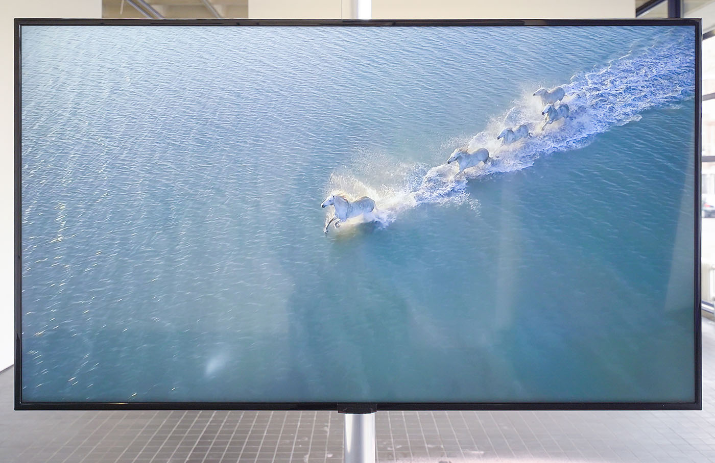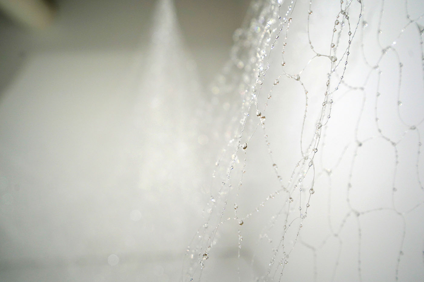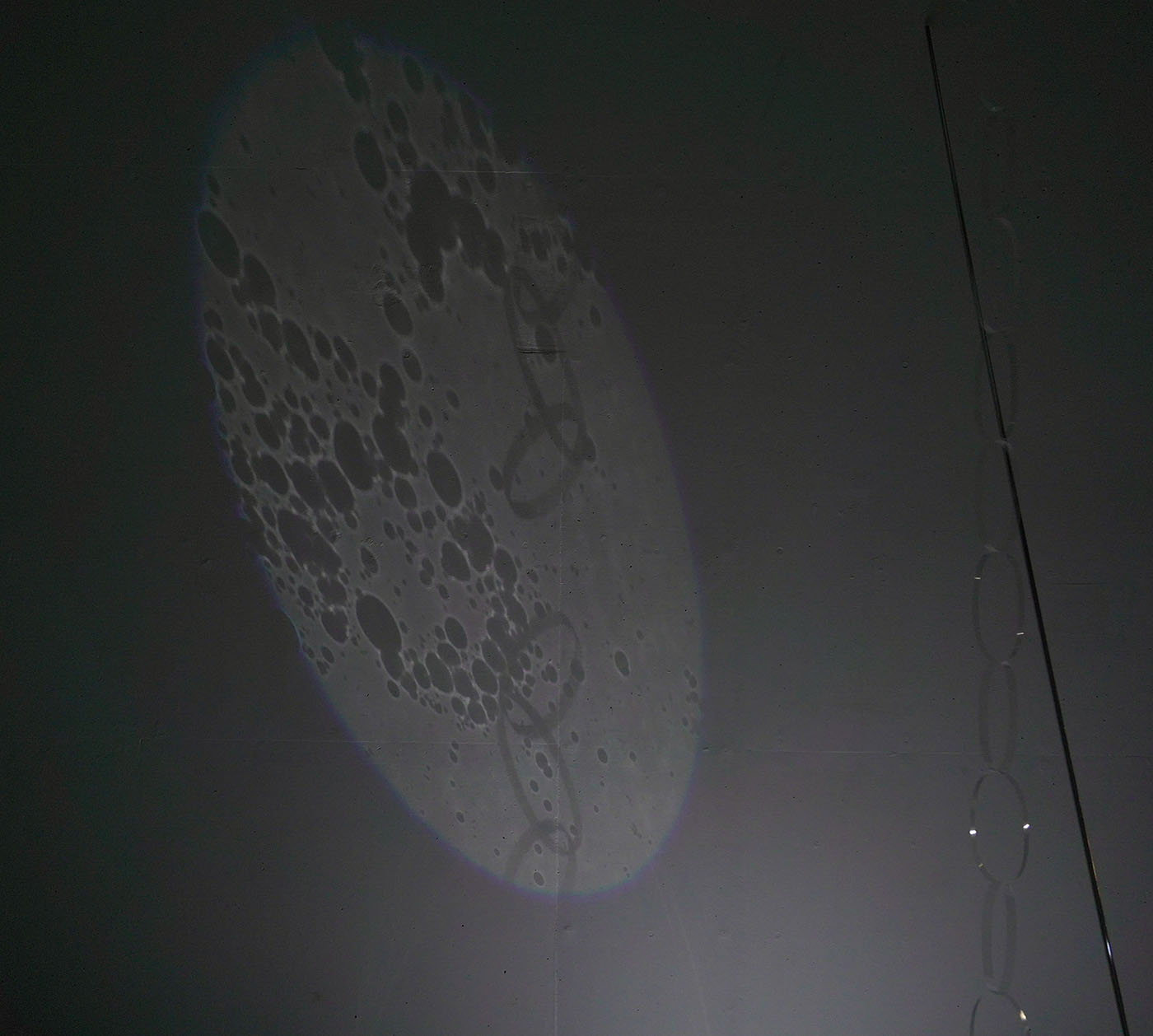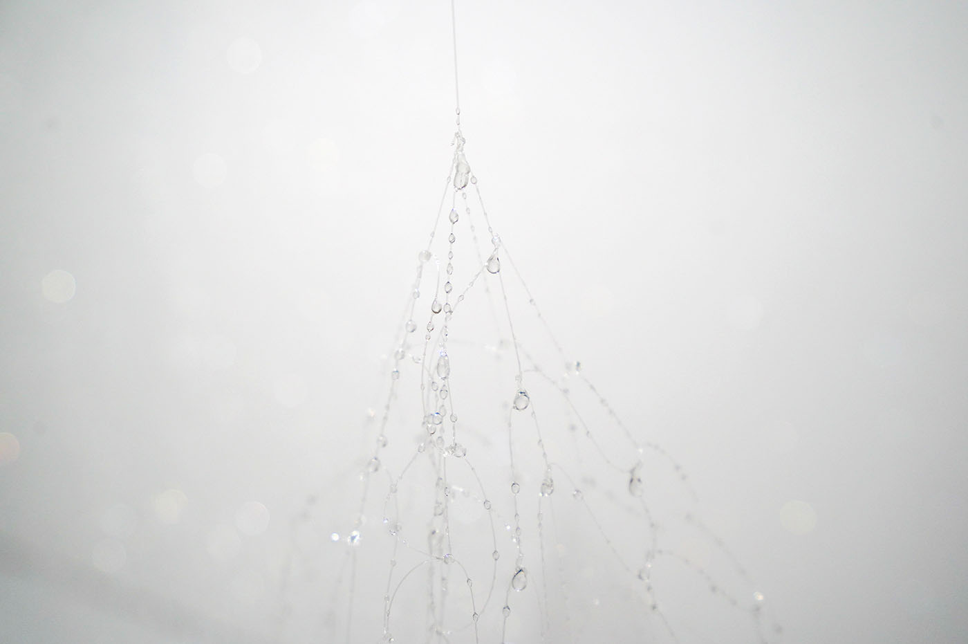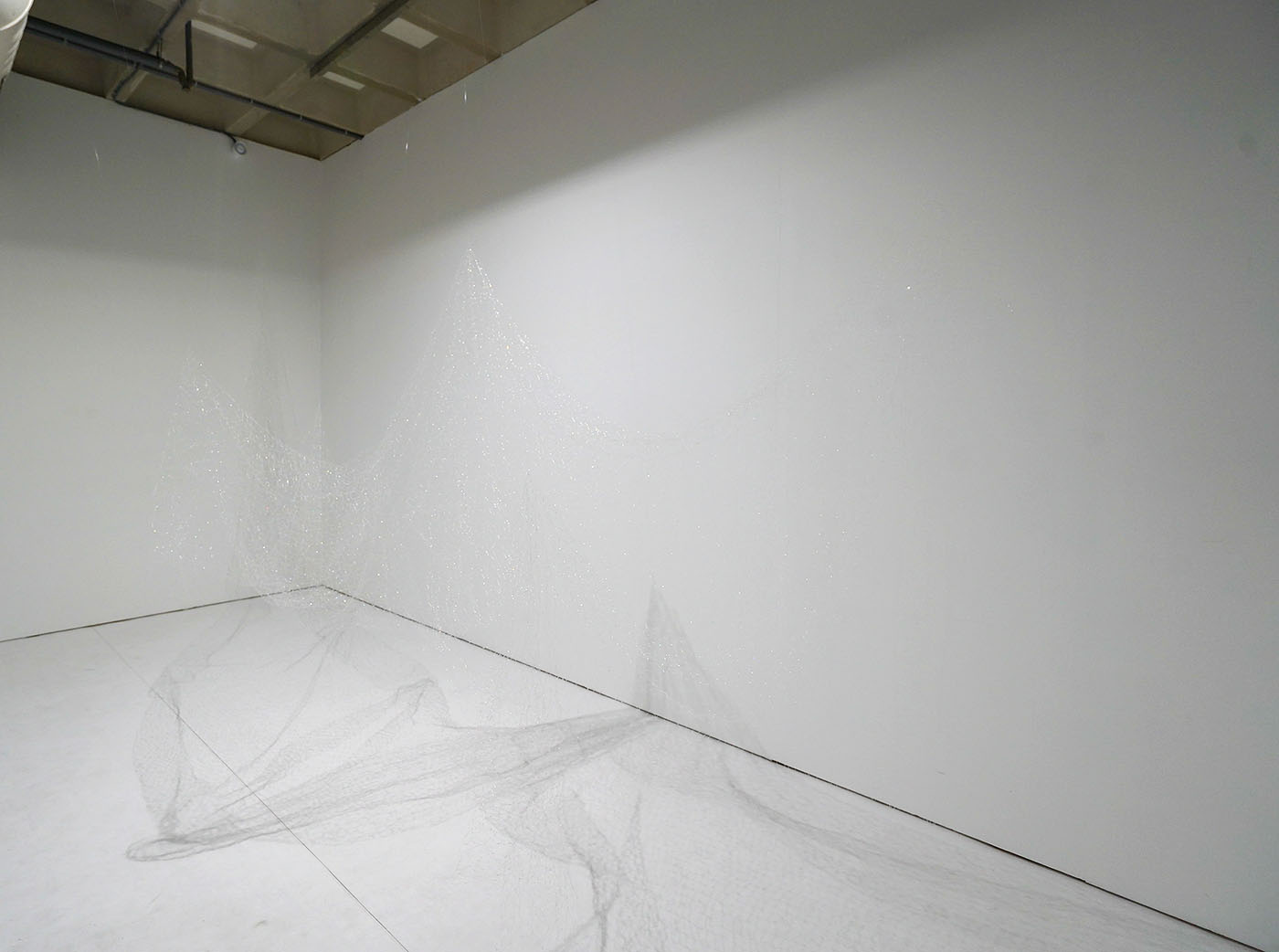 Het werk van Drčar is het meest heldere voorbeeld. Een stalen cirkel boort zich daar een weg door een muur, waarvan een reststuk nu lijkt te zweven. Een paar meter verderop staat een stalen plaat rechtop in dezelfde vorm. Alsof de stalen cirkel daar vandaan is gekomen en zo de muur vond. Het reageert onmiskenbaar op de plek, maar je zou het moeilijk site-specific kunnen noemen. Een ingreep die even een ander accent op de ruimte legt. Dat is even zo goed voor de laatste installatie van Qi, die druppels hars over nylondraad heeft laten druppelen. De ruimte is gevuld met een sculptuur dat grotendeels onzichtbaar is, een eeuwig stilstaande regen.