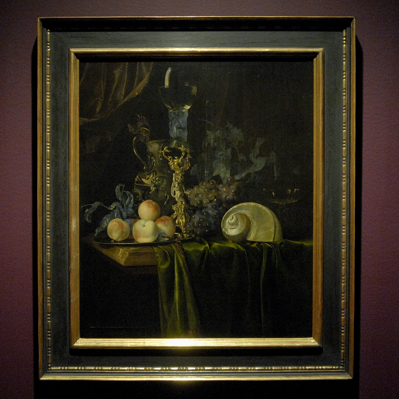 Willem van Aelst (?) – Stilleven met siervaatwerk, nautisschelp en vruchten op een donker kleed – Olieverf op doek, 1659