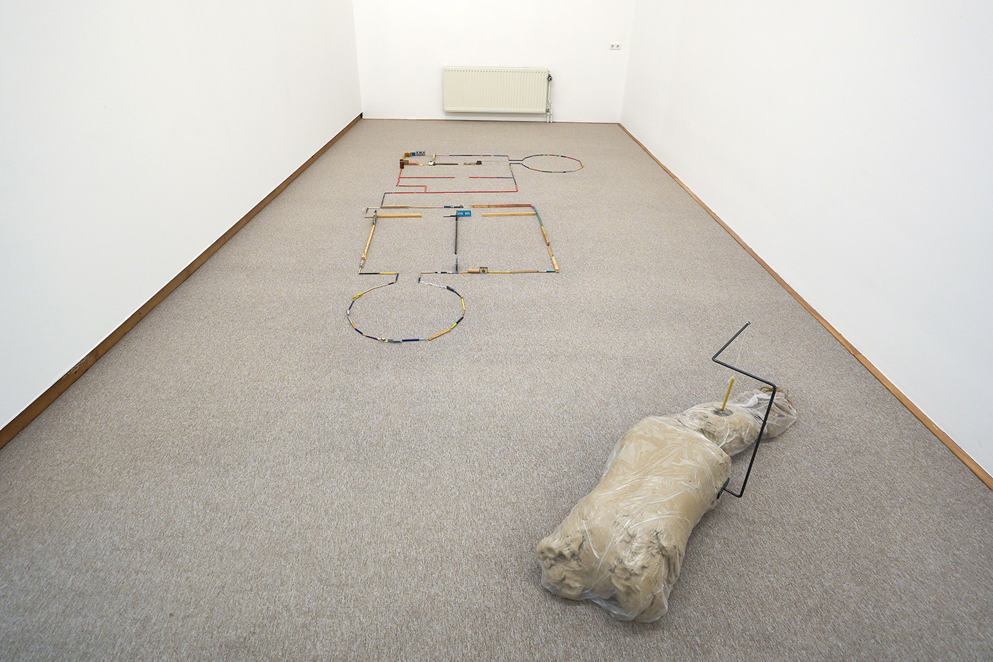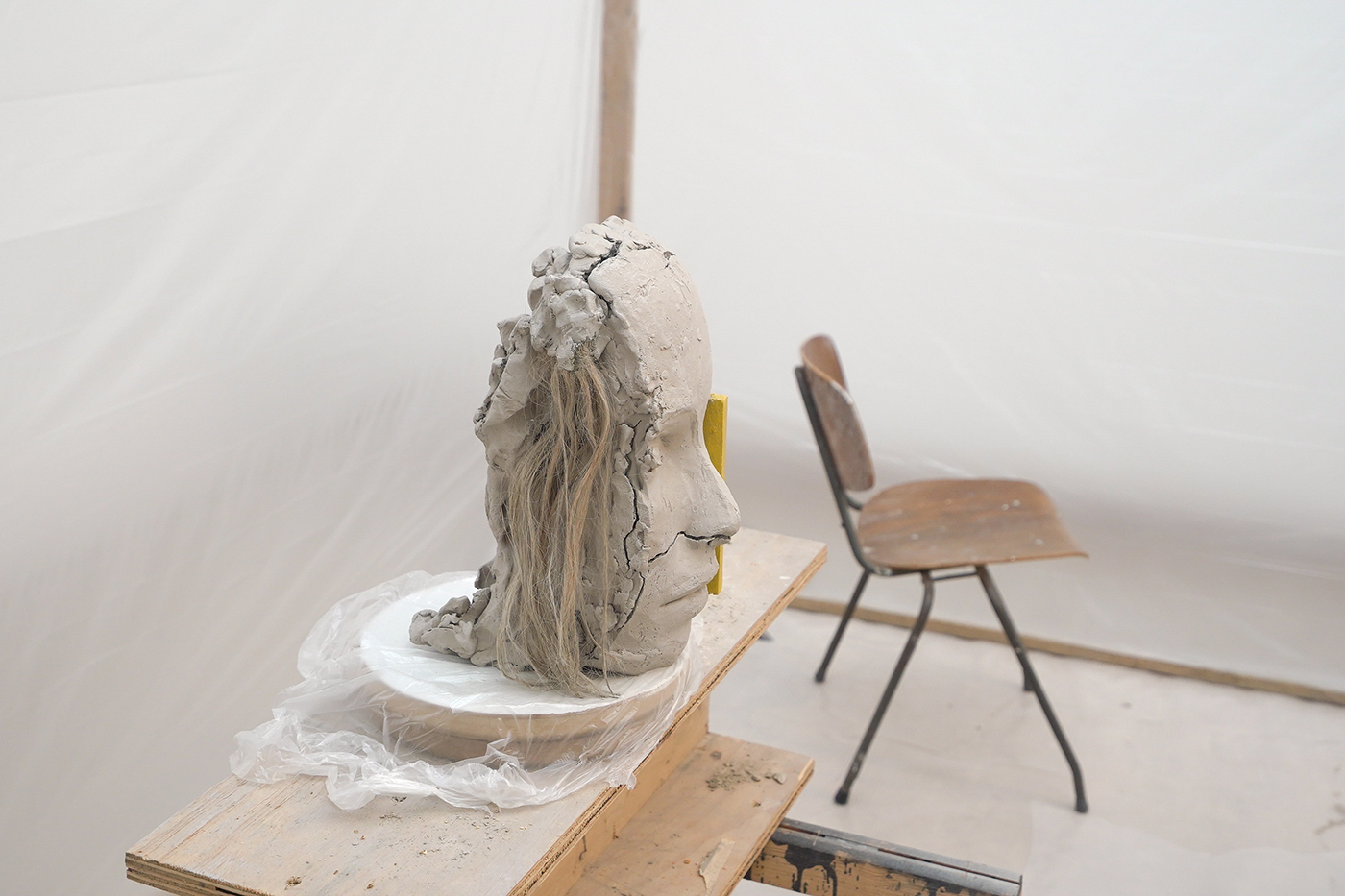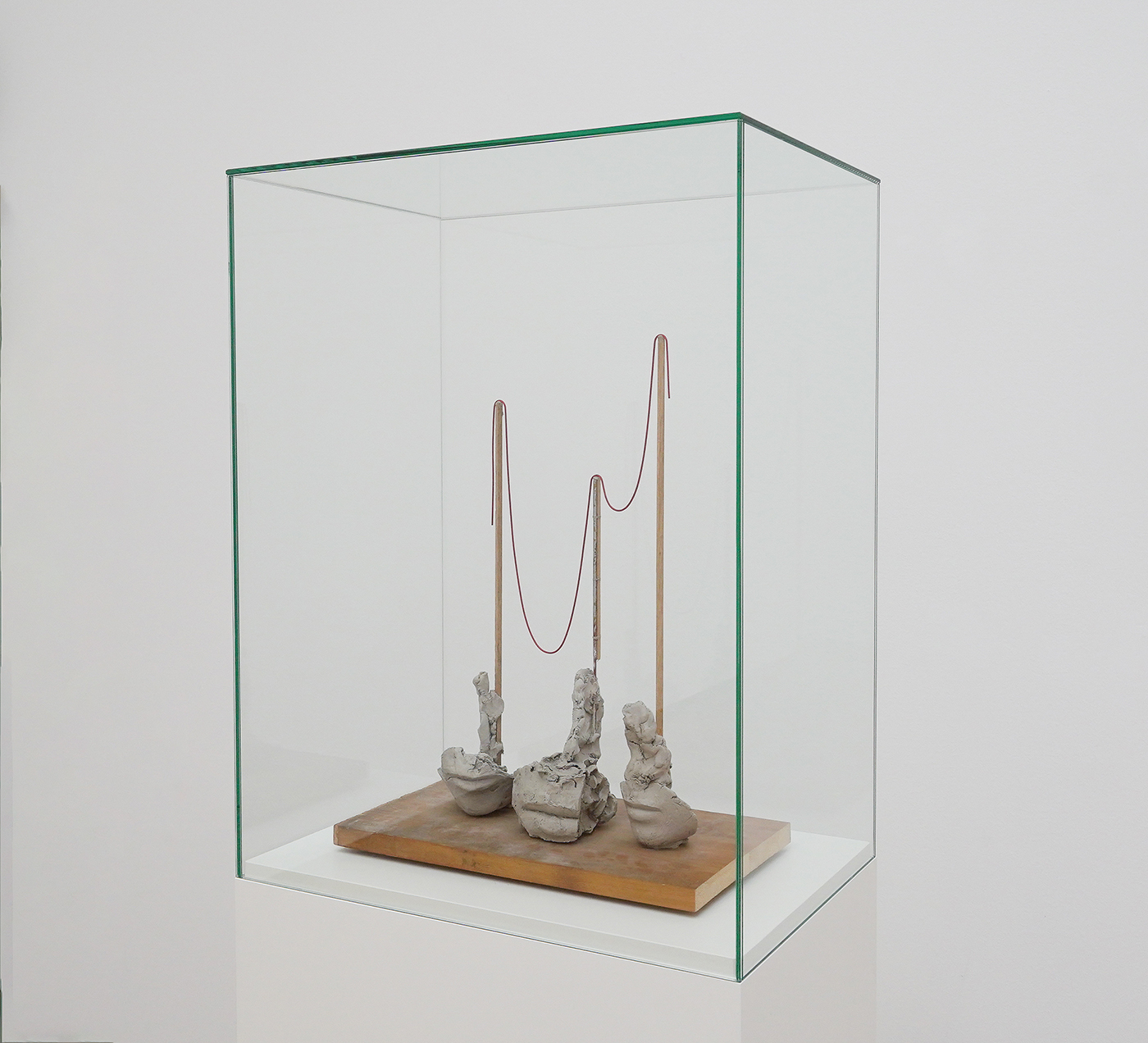 Mark Manders – Inhabited for a Survay (15-08-2007) – Verschillende materialen & Clay Figure with Yellow Pencil – Beschilderde epoxy, ijzer, touw, haar en plastic