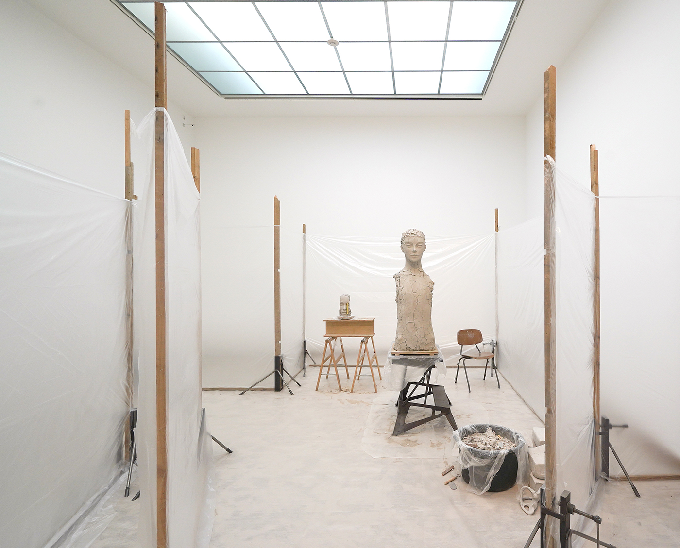 Mark Manders – Room with Unfired Clay Figure – Beschilderd brons, hout, plastic, beschilderd keramiek, stoel en beschilderd epoxy