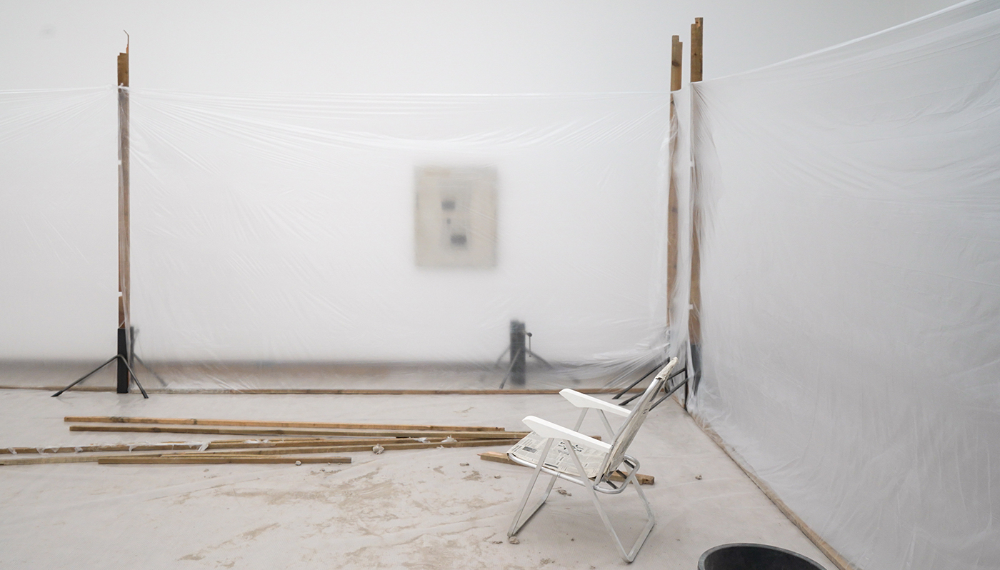 Mark Manders – Ramble Room Chair – Hout, beschilderde epoy, offsetdruk op papier en stoel & Perspective Study – Acryl en offsetdruk op papier en hout