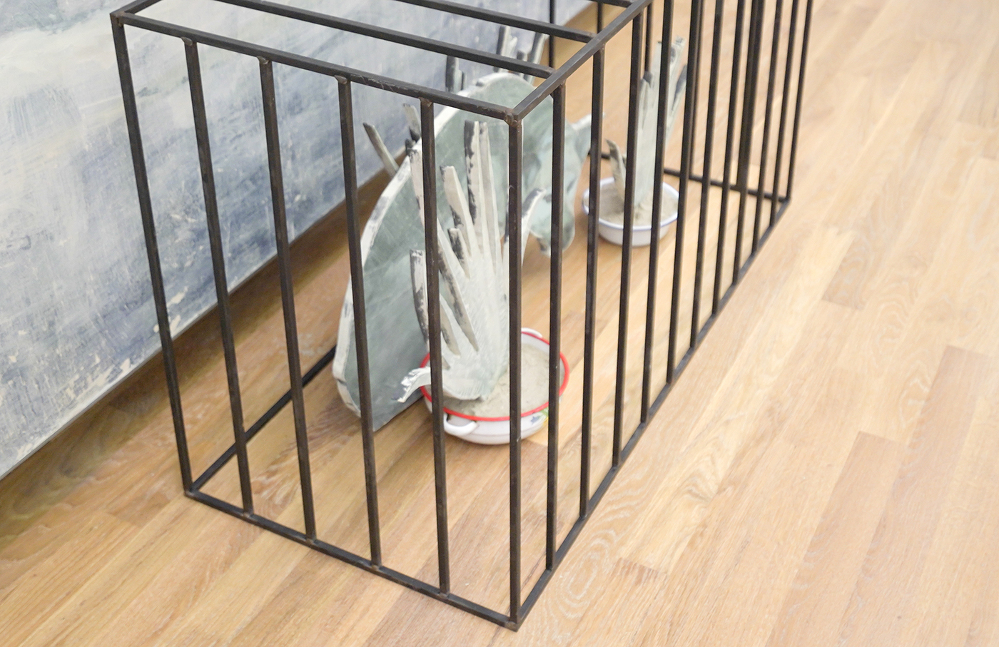 Arturo Kameya – Pido la palabra (I request the floor) (serie) – Keramiek, zinken emmers, staal, pompen, metalen bakken, zand, twee glazen figuren, vogel gemaakt van namaakveren en schuim (detail)