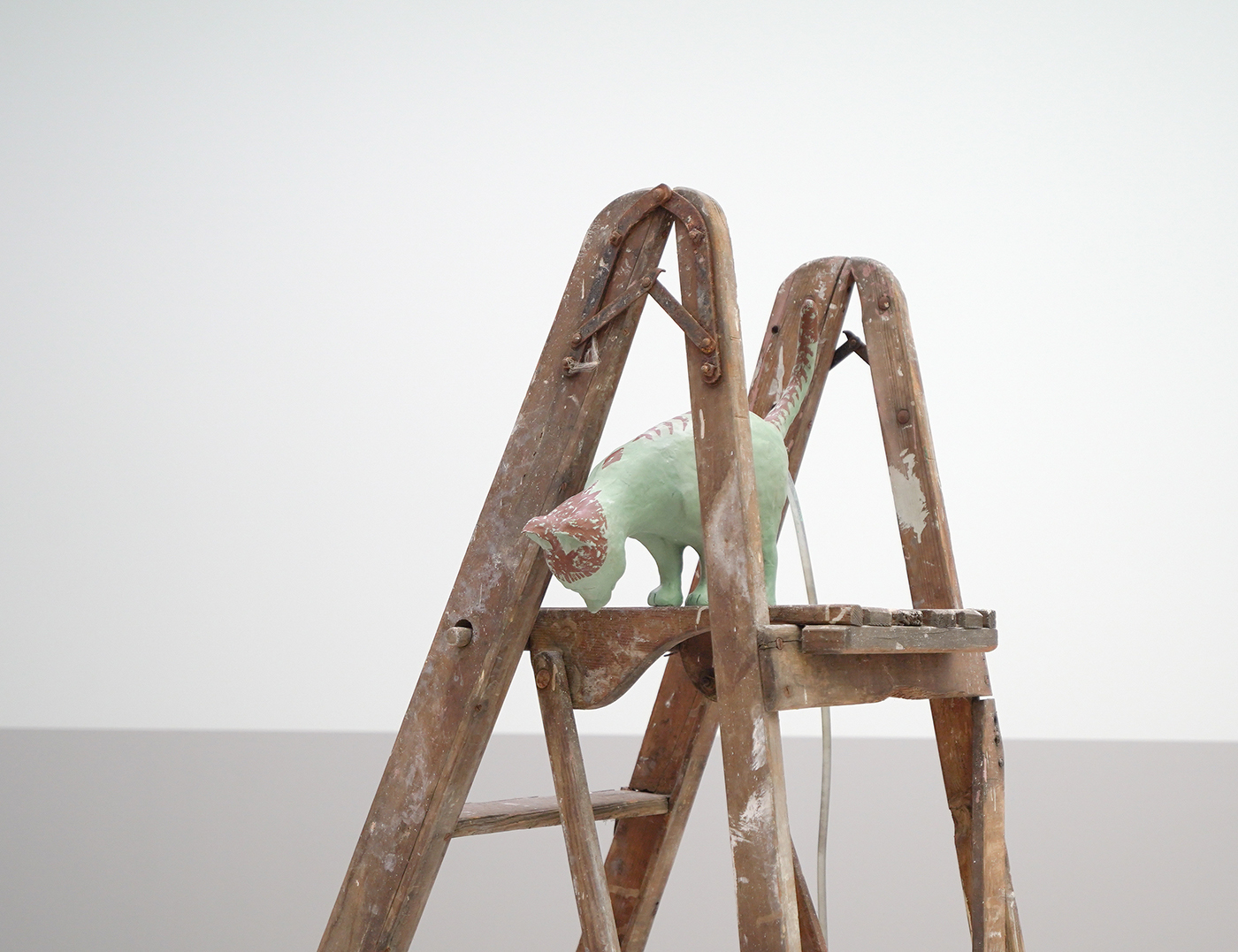 Arturo Kameya – Dinner is served – Houten ladder, glazen flessen, plastic slang, keramische kat, epoxy klei kat, houten kruk, tinnen pot, druppelpompen en vogelvormige bellen (detail)