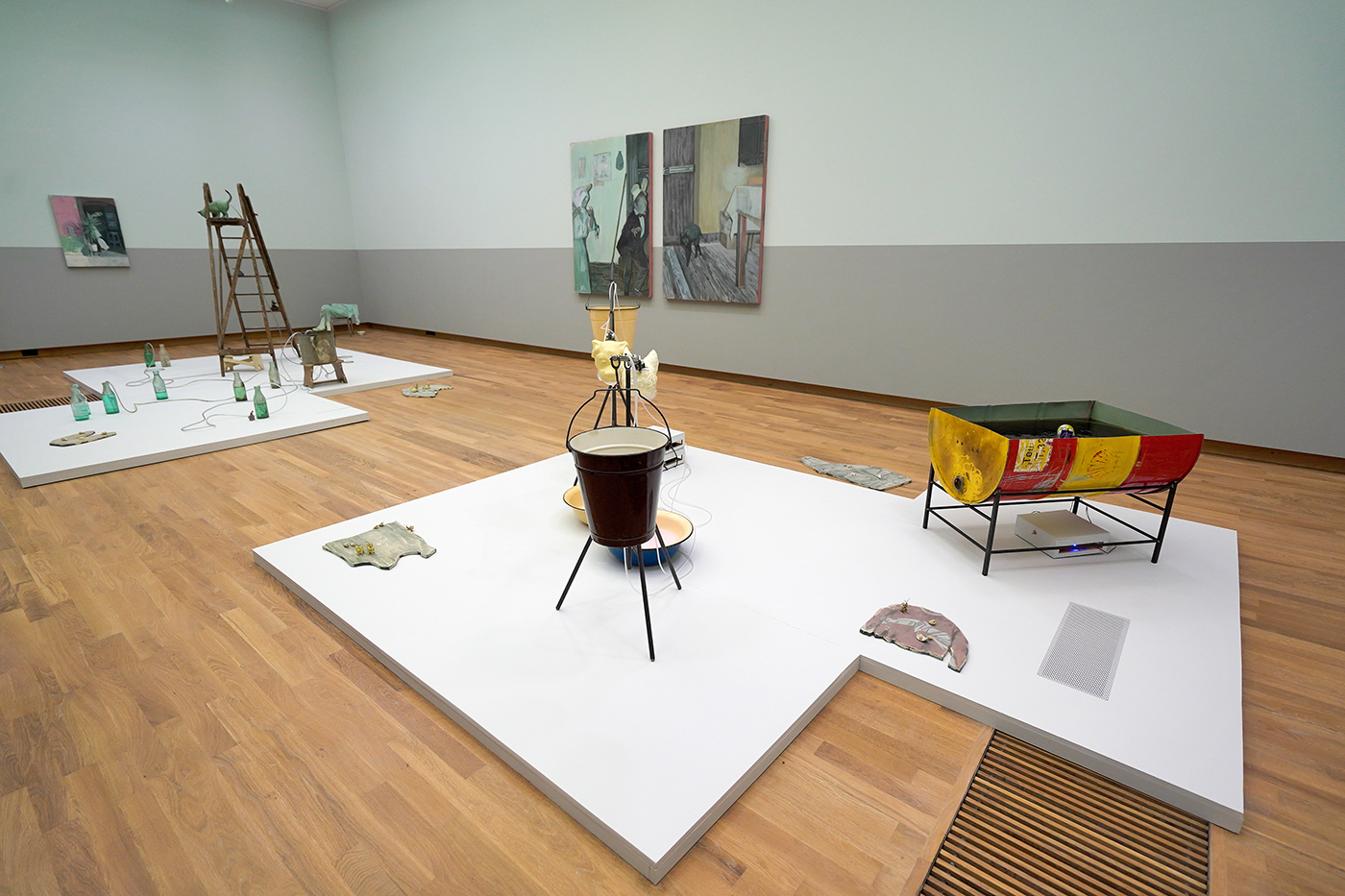 Arturo Kameya – Pido la palabra (I request the floor) (serie) – Keramiek, zinken emmers, staal, pompen, metalen bakken, zand, twee glazen figuren, vogel gemaakt van namaakveren en schuim