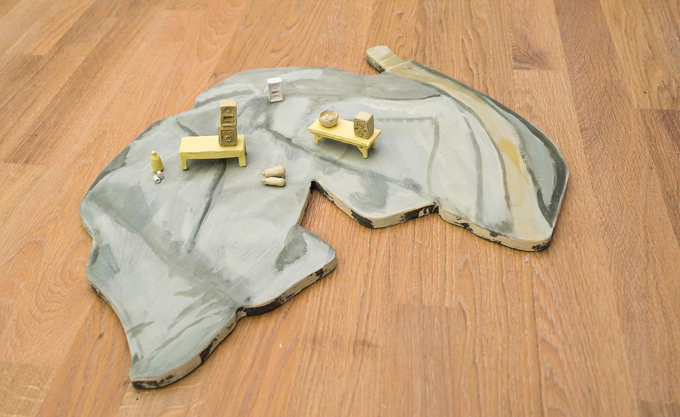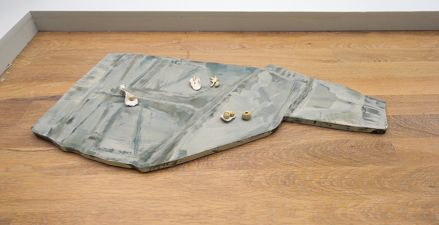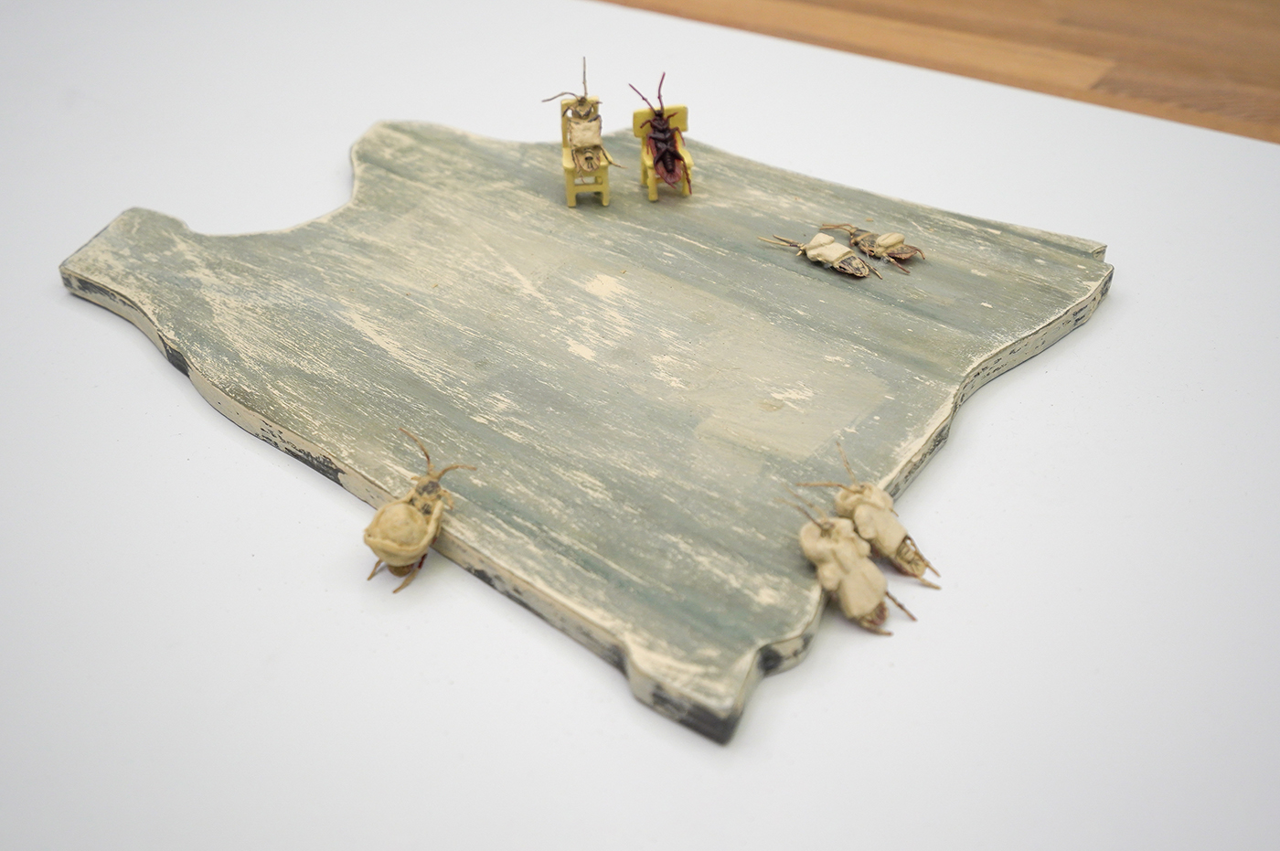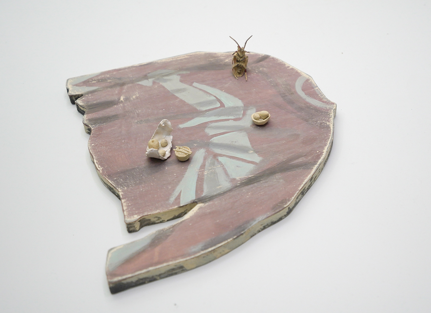 Arturo Kameya – Ghosts are another mouth to feed – Acrylverf en kleipoeder op hout, plastic kakkerlakken, gevonden objecten en keramiek