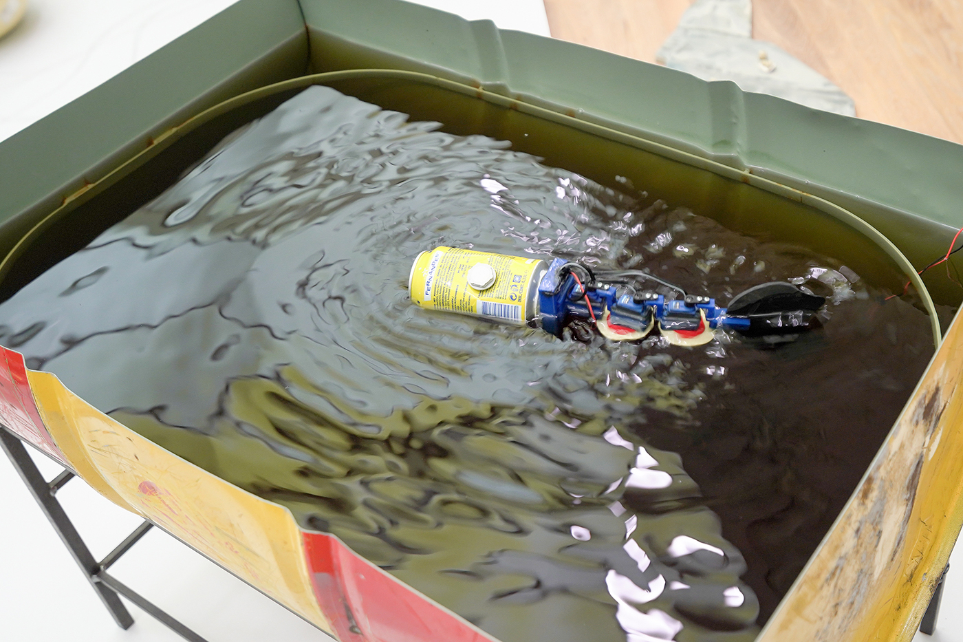 Arturo Kameya – Greatest hits for little fishes – Olievat, luidsprekers, water en electronische vis (detail)