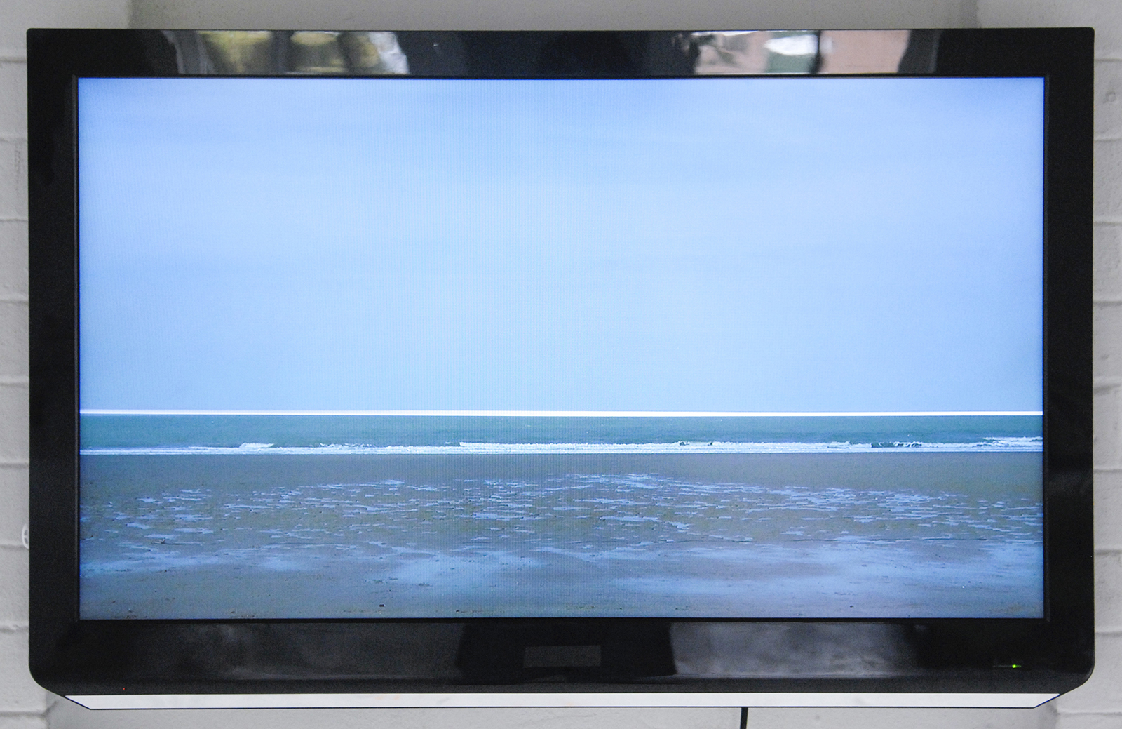 Een wit lint dat zachtjes beweegt in de wind geeft de horizon aan. Eenvoudig gedaan maar erg sterk beeld;