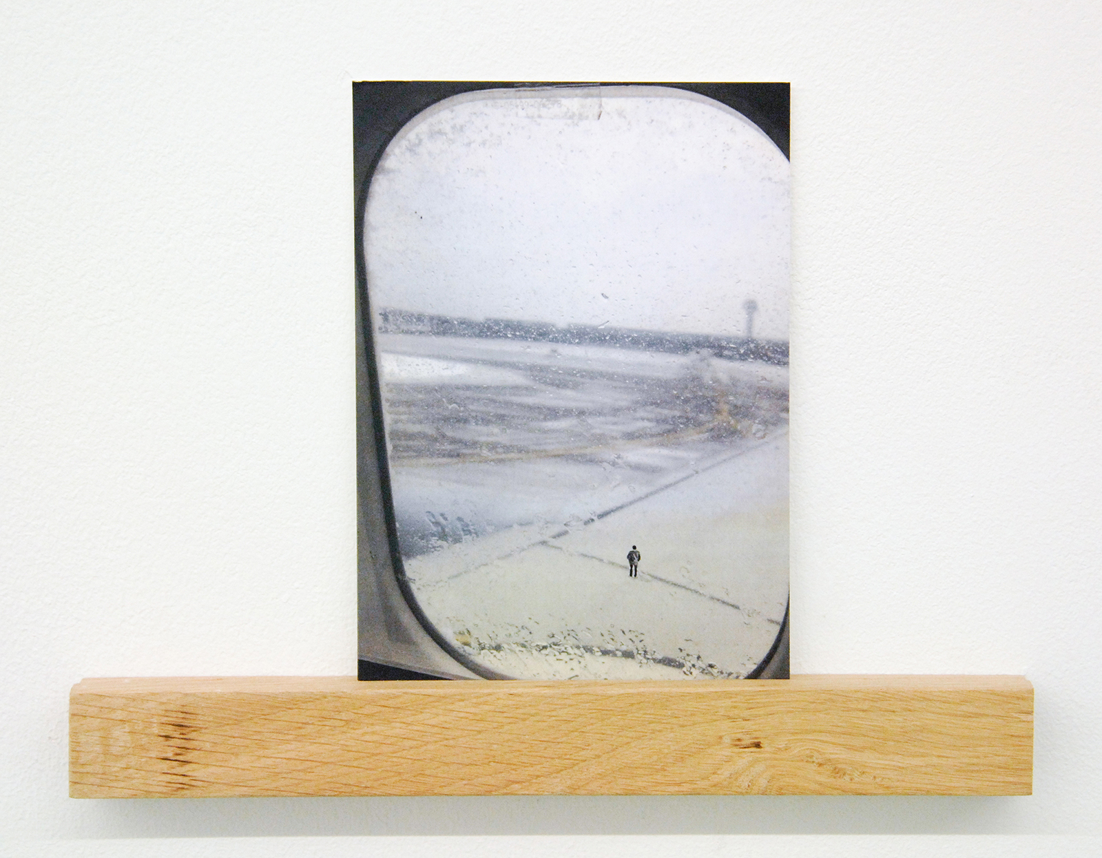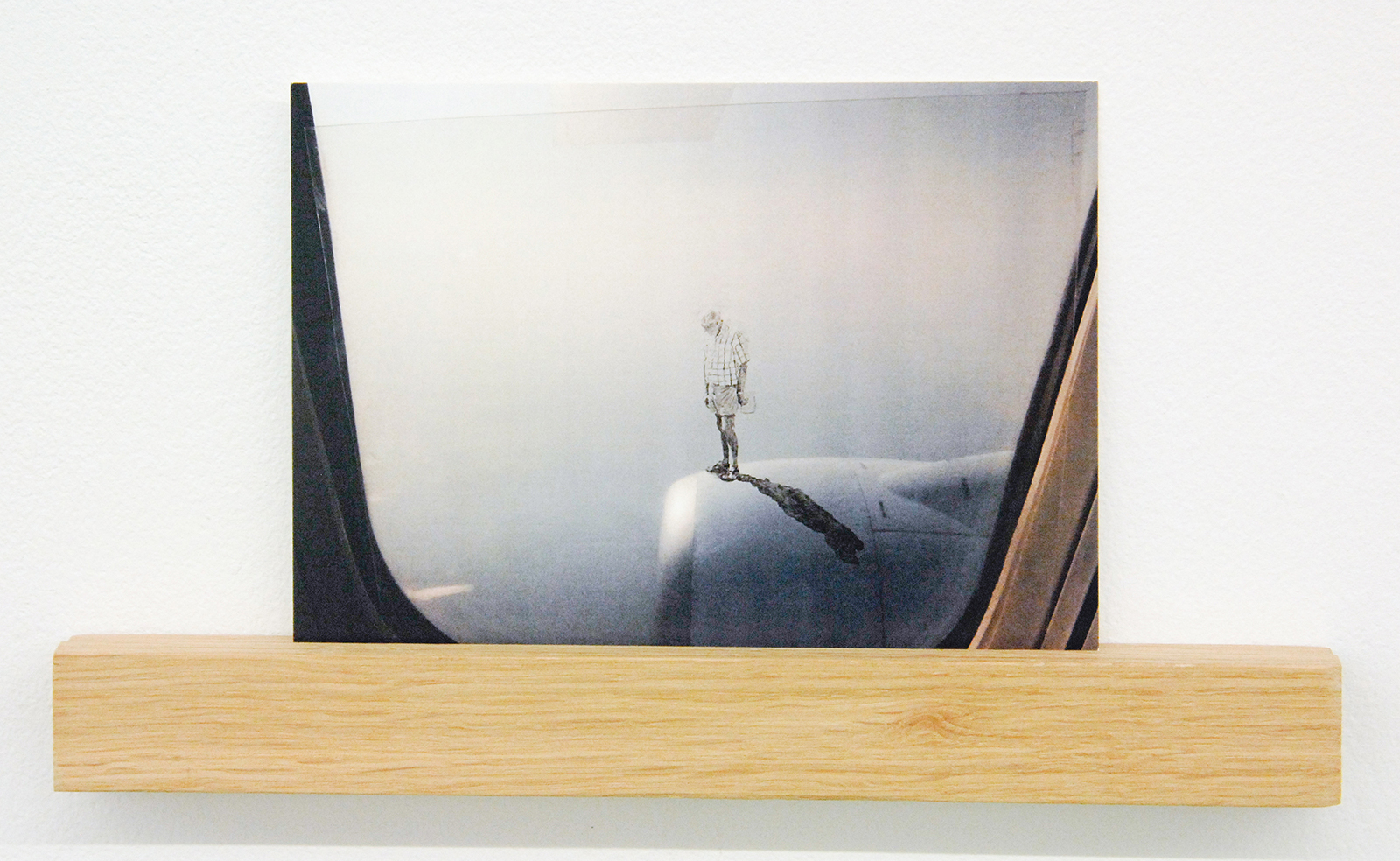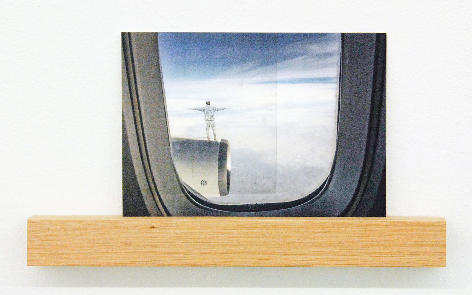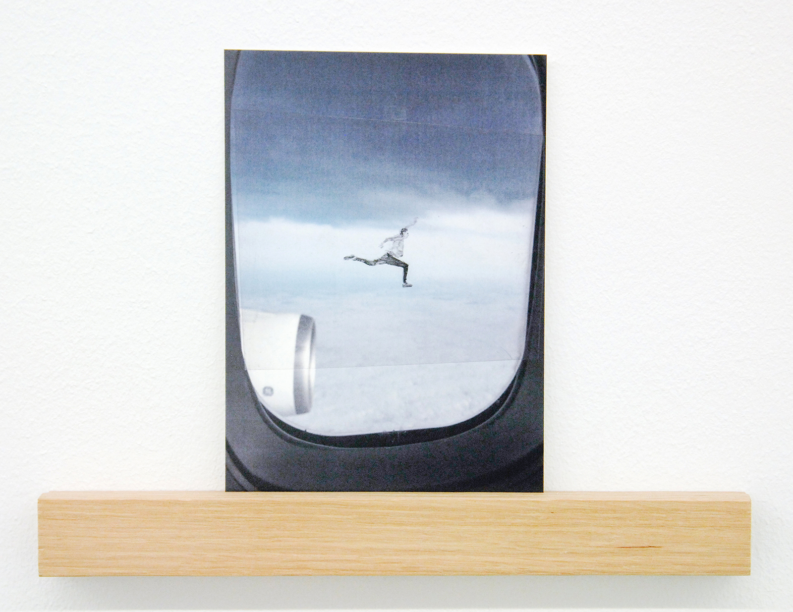 Het werk van Claire Harvey (1976) is nog veel kleiner. Het grootste werk in deze tentoonstelling is een 11 bij 9 centimeter, een postkaart met daarop uitzicht uit een vliegtuigraam waarbij een figuurtje op de vleugel staat, springt of andere acties uitvoert. Hier is niets monumentaal aan, dit zijn eerder leuke grapjes.