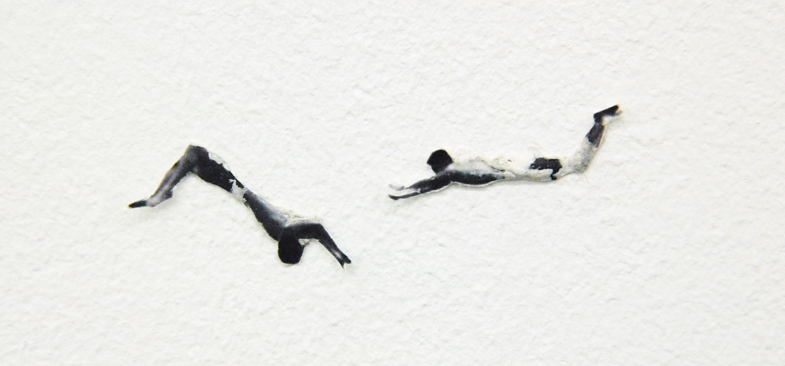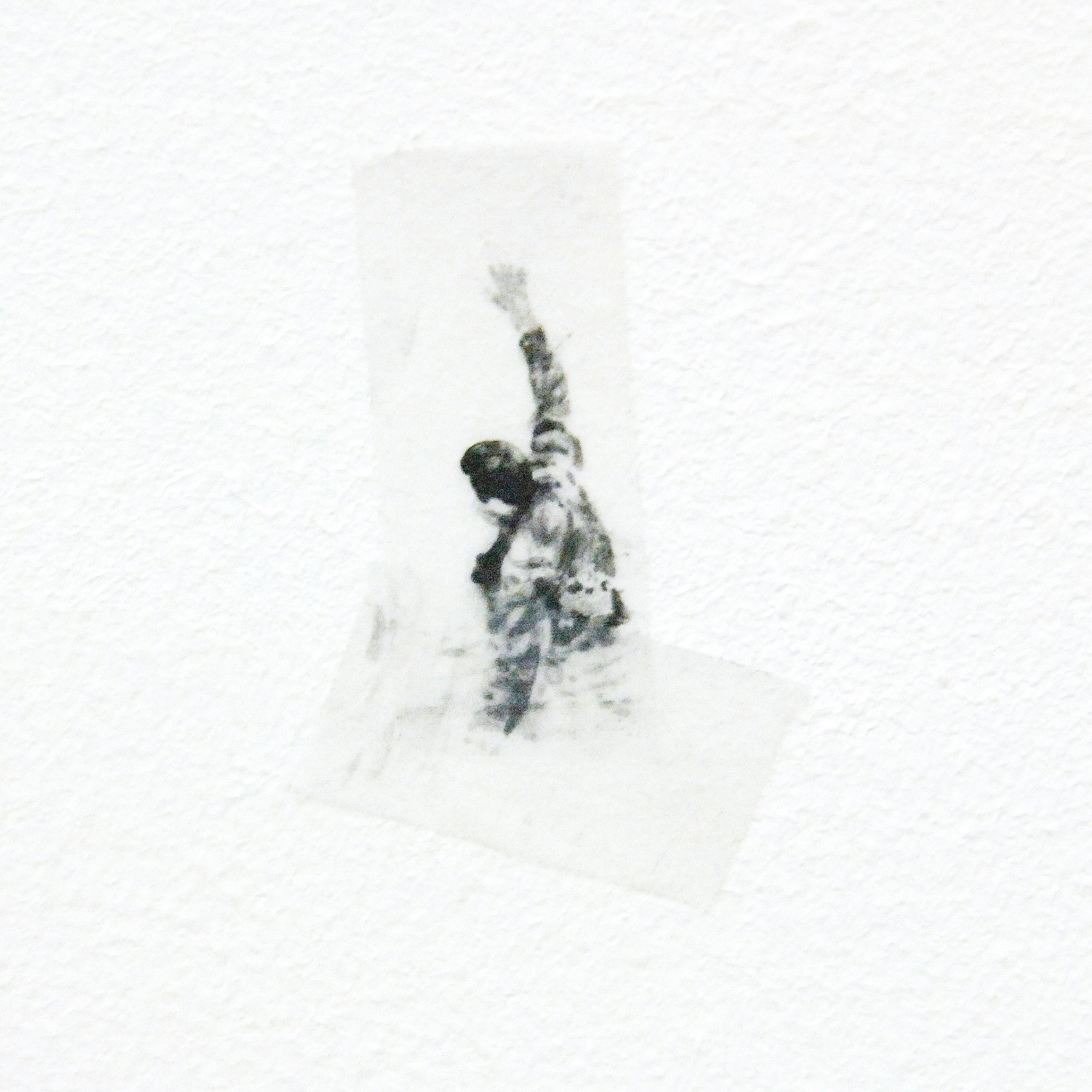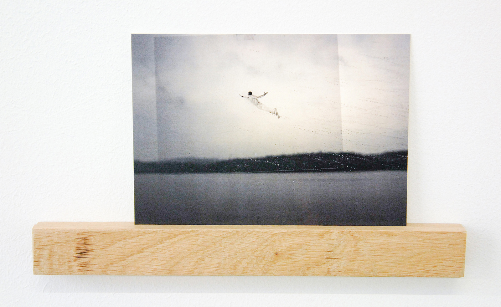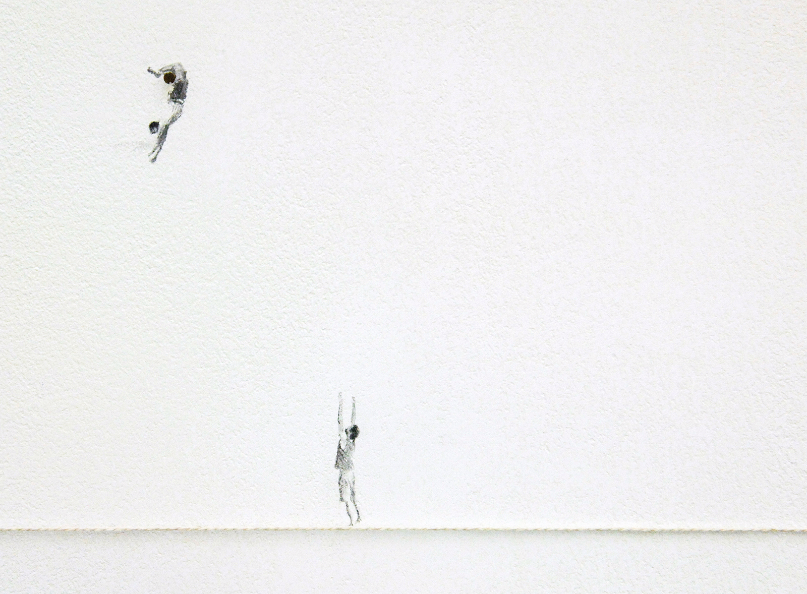 Het werk van Claire Harvey (1976) is nog veel kleiner. Het grootste werk in deze tentoonstelling is een 11 bij 9 centimeter, een postkaart met daarop uitzicht uit een vliegtuigraam waarbij een figuurtje op de vleugel staat, springt of andere acties uitvoert. Hier is niets monumentaal aan, dit zijn eerder leuke grapjes.