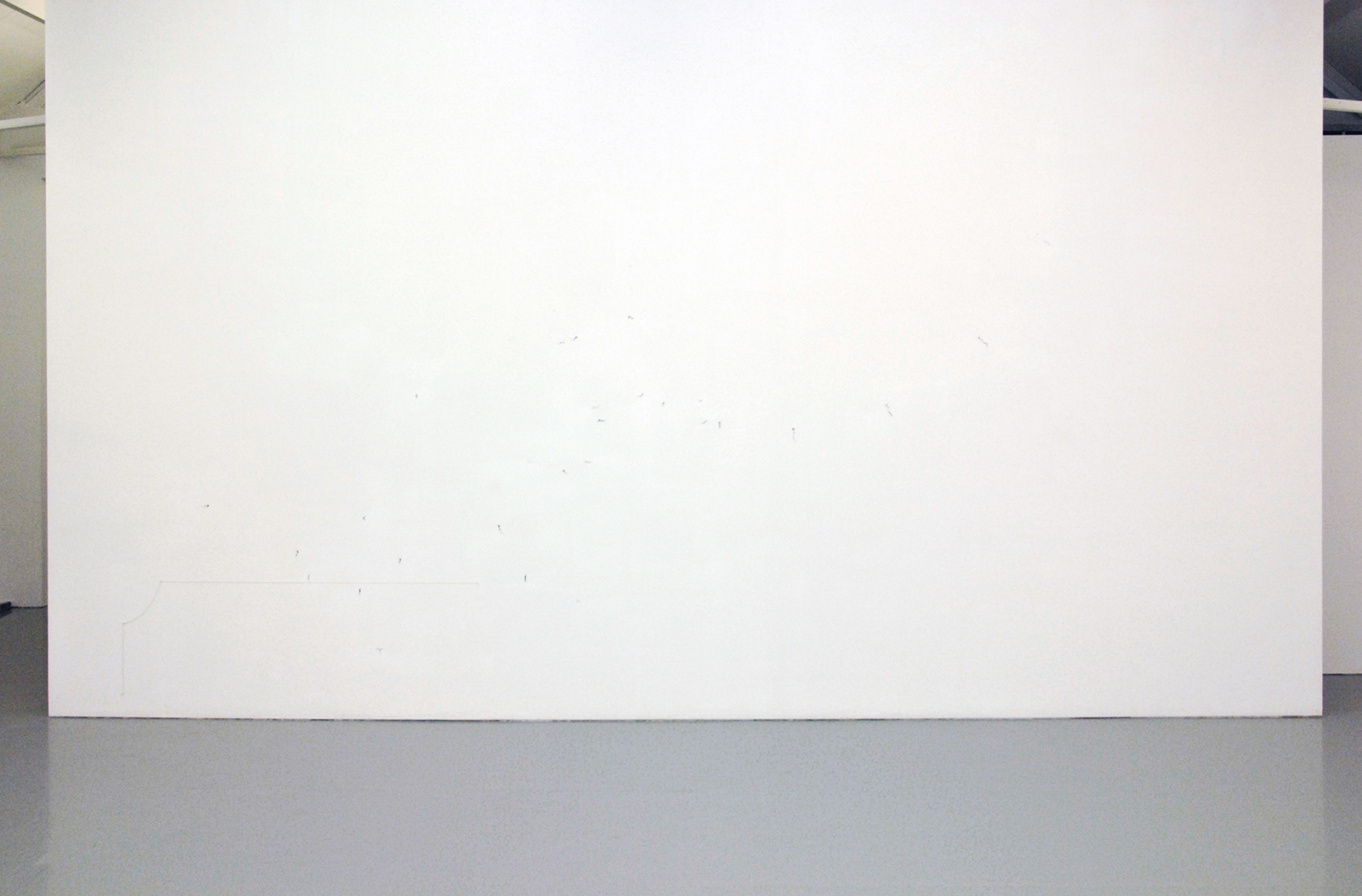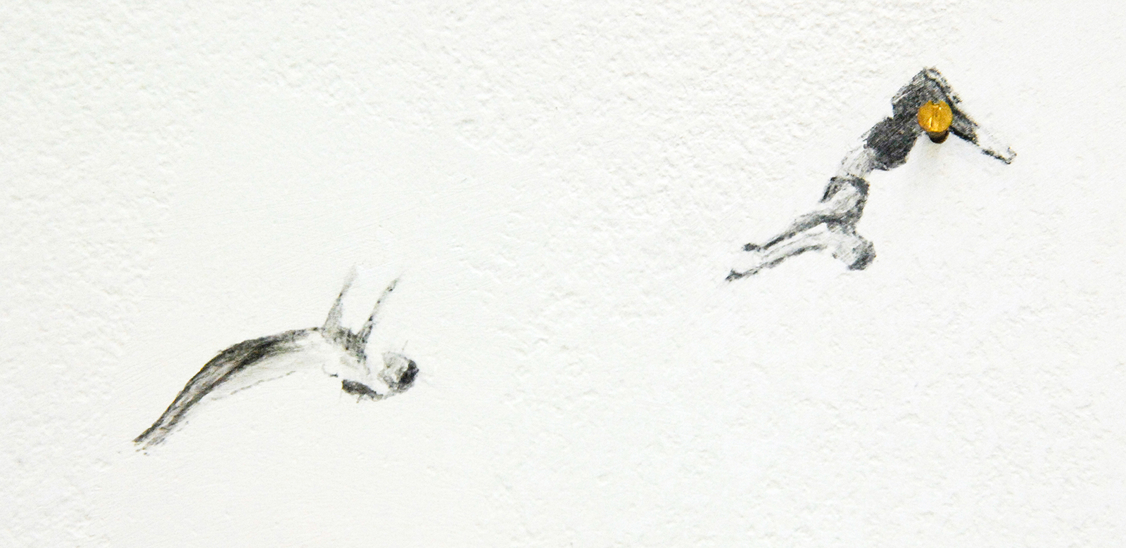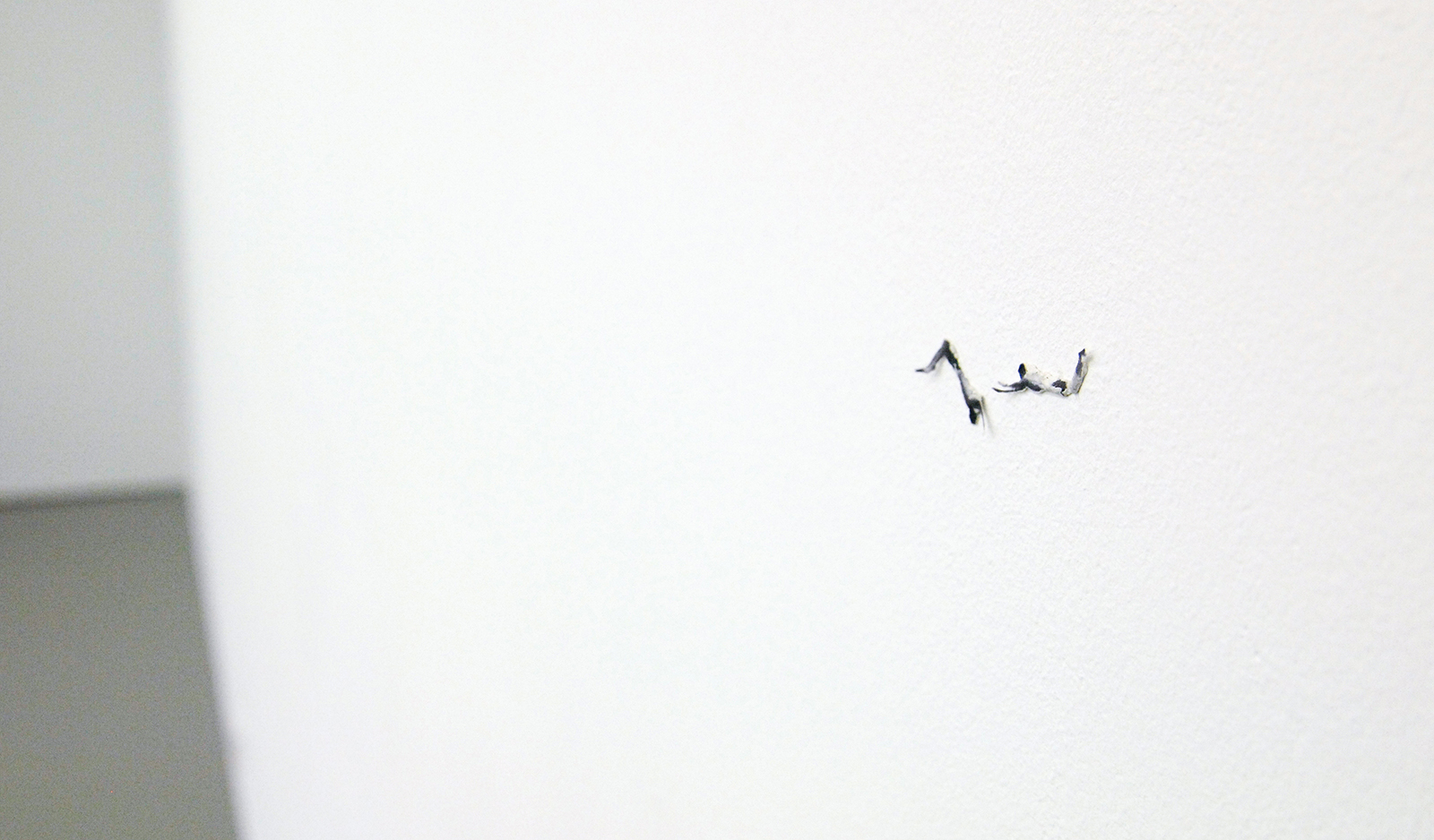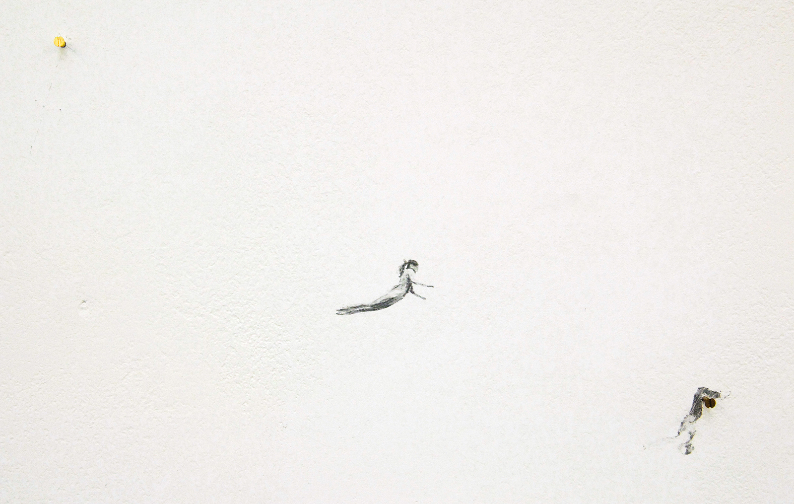 Pas op het moment dat Harvey echt klein gaat werken, namelijk op stukjes plakband of op de muur zeer kleine figuurtjes schildert wordt het ineens super monumentaal. Een van de werken loopt uit op de links aanliggende wand, slechts twee kleine figuurtjes zweven daar op, maar toch bespelen ze de gehele wand met een ingreep die nauwelijks groter is dan mijn wijsvinger, of een langpootmug…