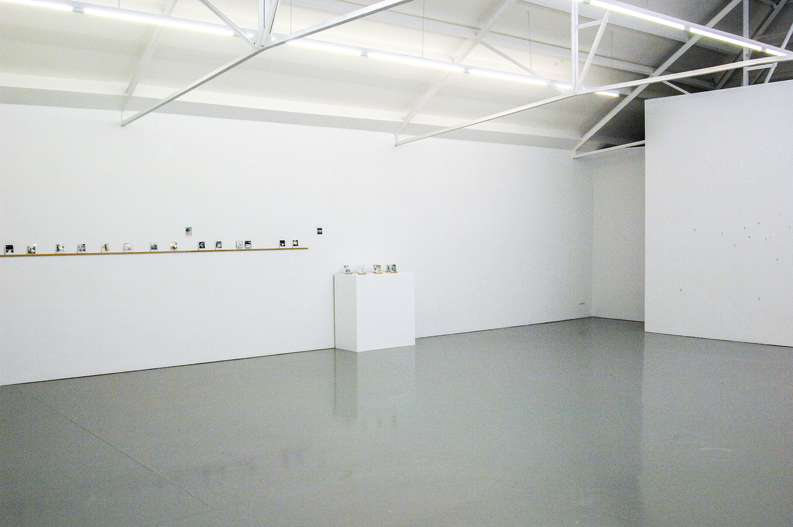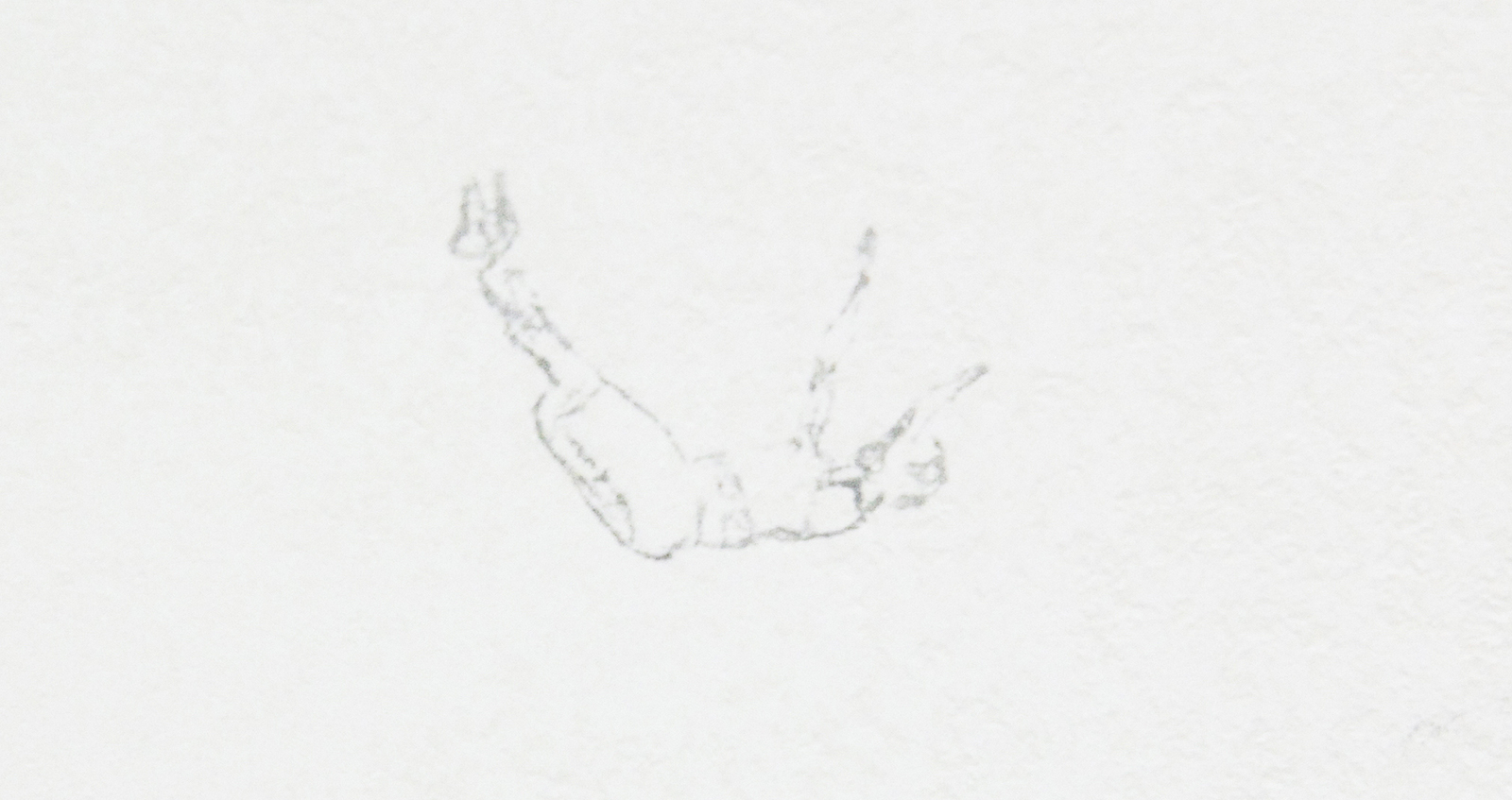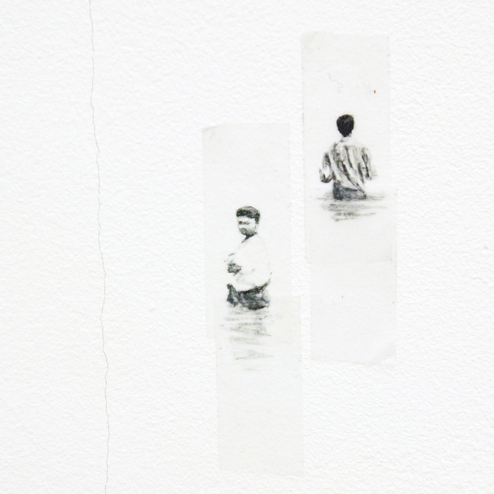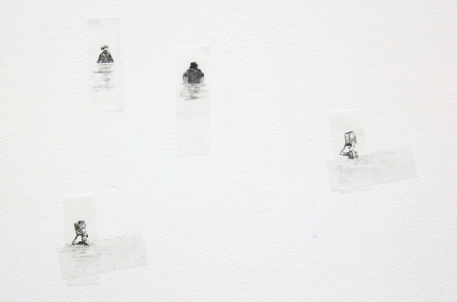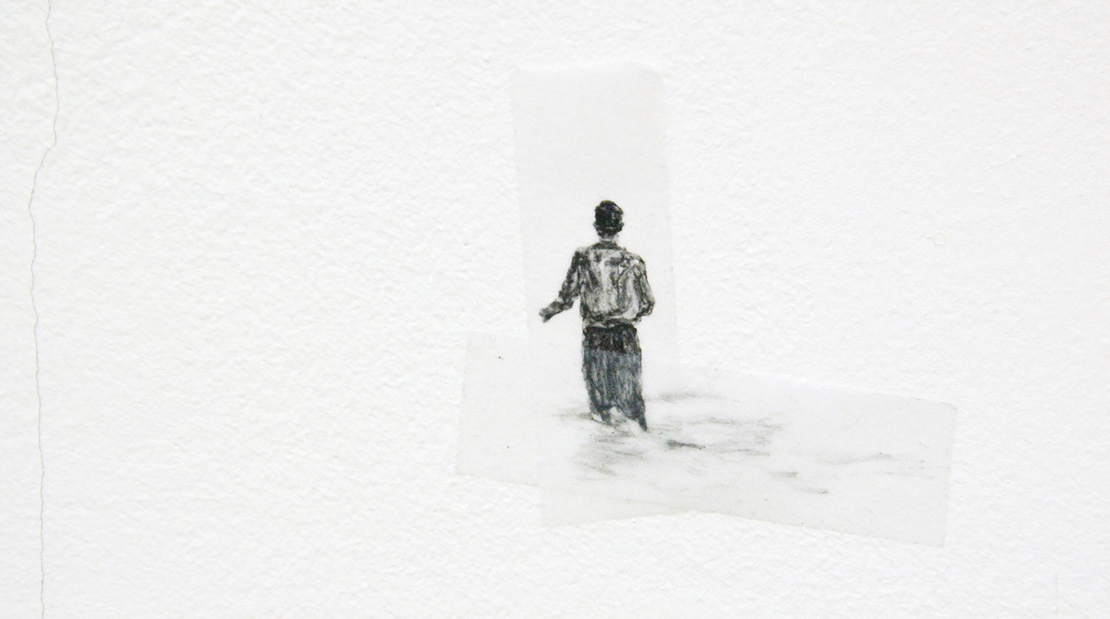 Pas op het moment dat Harvey echt klein gaat werken, namelijk op stukjes plakband of op de muur zeer kleine figuurtjes schildert wordt het ineens super monumentaal. Een van de werken loopt uit op de links aanliggende wand, slechts twee kleine figuurtjes zweven daar op, maar toch bespelen ze de gehele wand met een ingreep die nauwelijks groter is dan mijn wijsvinger, of een langpootmug…
