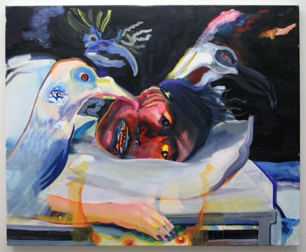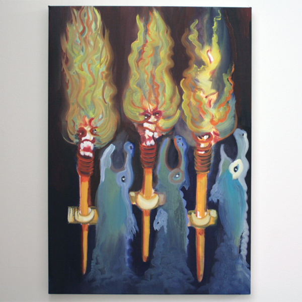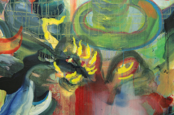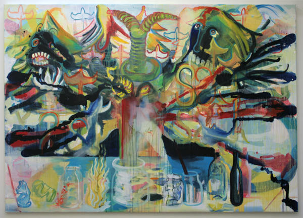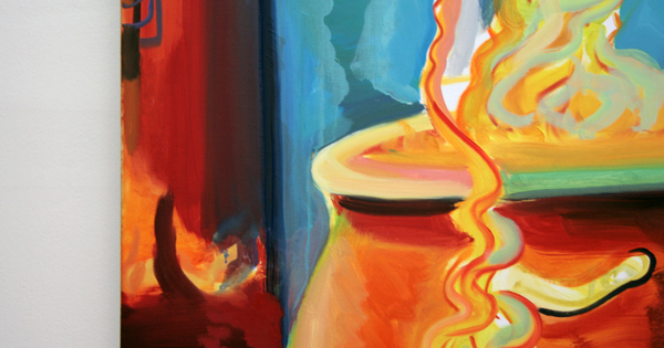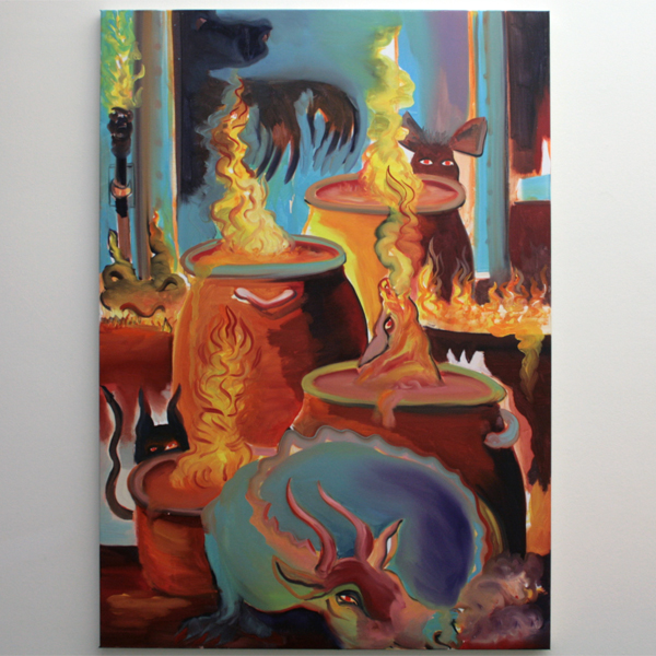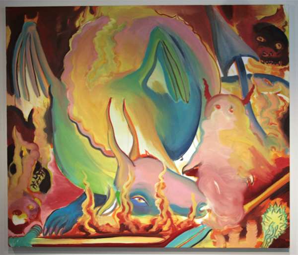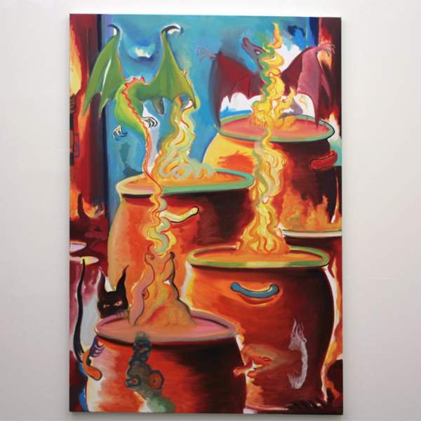 Zo niet bij Heddy-John Appeldoorn (1975), het werk is doorspekt met schildersgemak, vrolijke kleuren, speels gekwastel en vooral plezierig. Draken en heksenketels, ridders en kleine monstertjes, als uit sprookjes gelopen. En voor de verandering, is dat een hele opluchting om te zien. Als is het maar om te zien hoe serieus en zwaarmoedig anderen zijn.