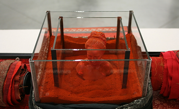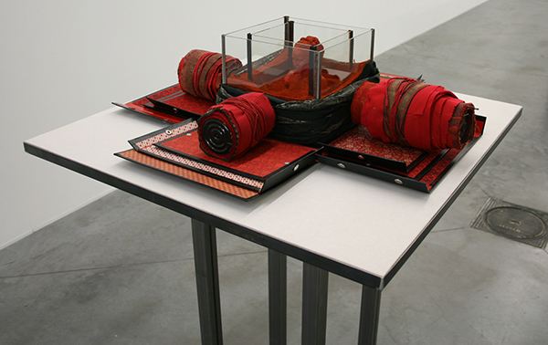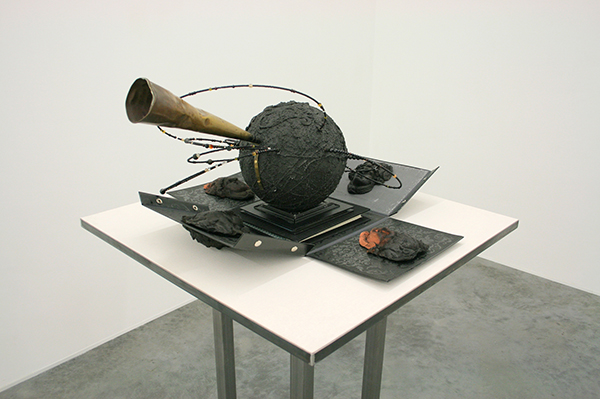 Ricardo Brey – The Striking Pink Color of the Blood of the Green Lion – 40x75x80cm Karton, metaal, glas, klei, trompet, vulkanisch gesteente, zwarte emulsie