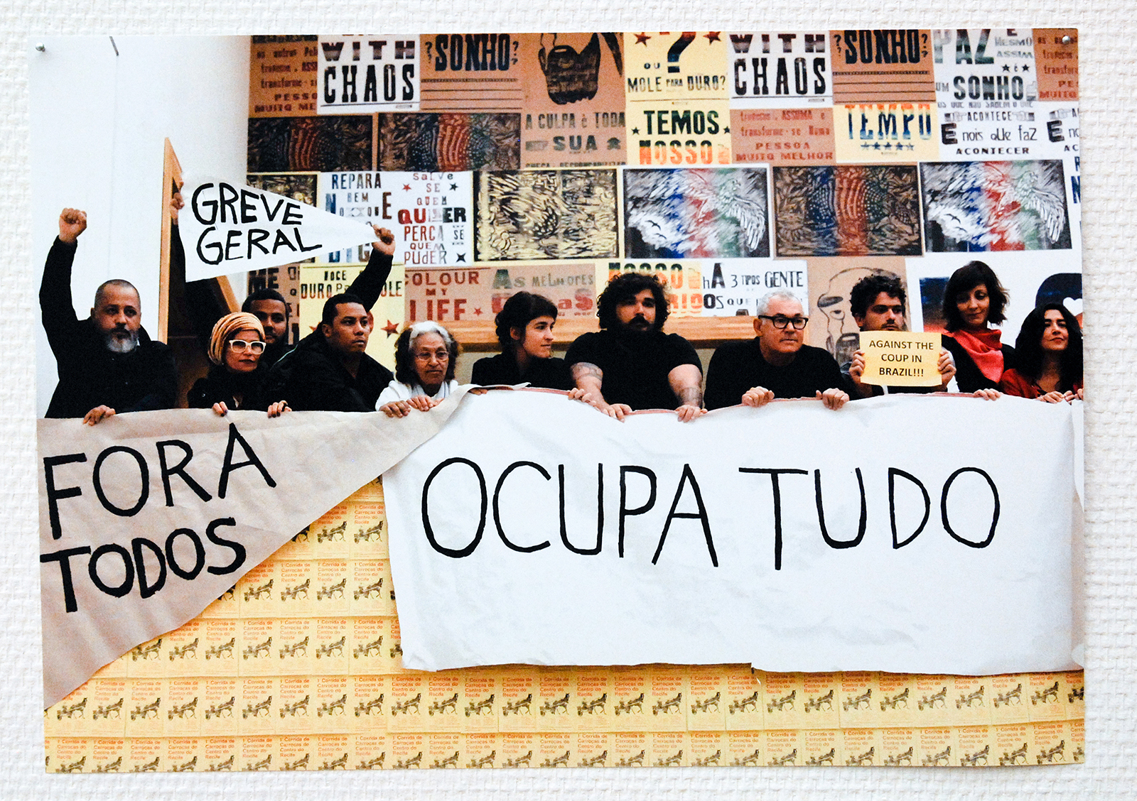 Braziliaanse kunstenaars en galeriehouders protesteren tijdens de opening tegen de regering die net op dat moment het cultuurdepartement wegbezuinigde.