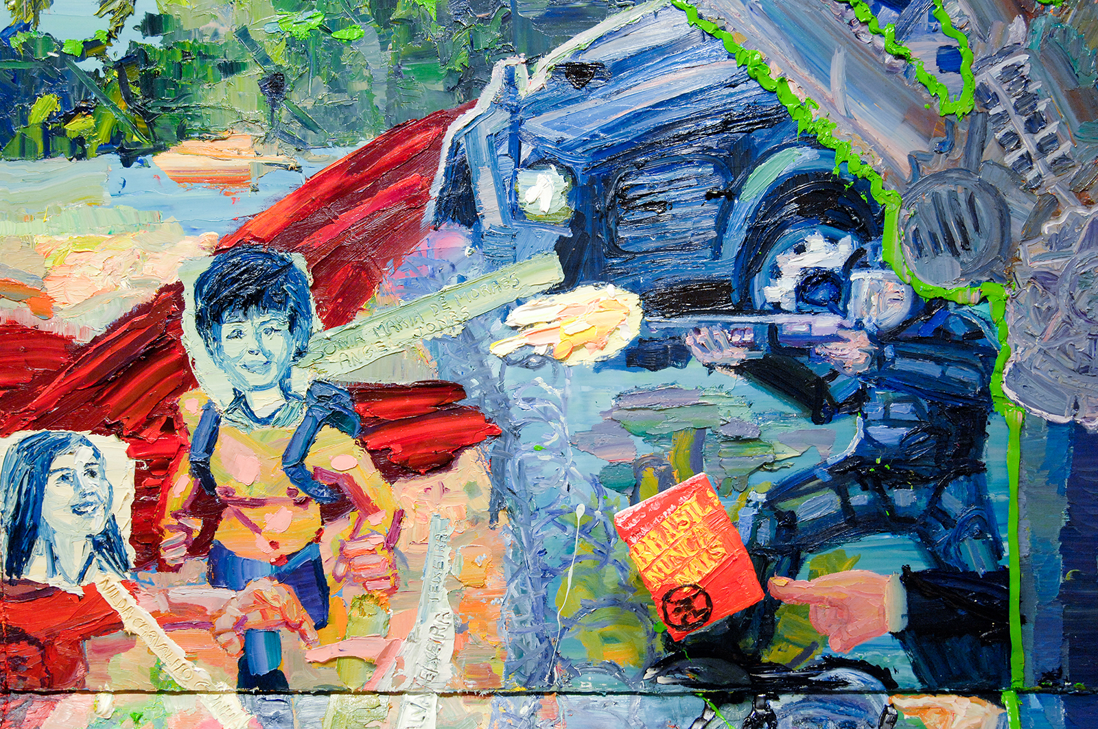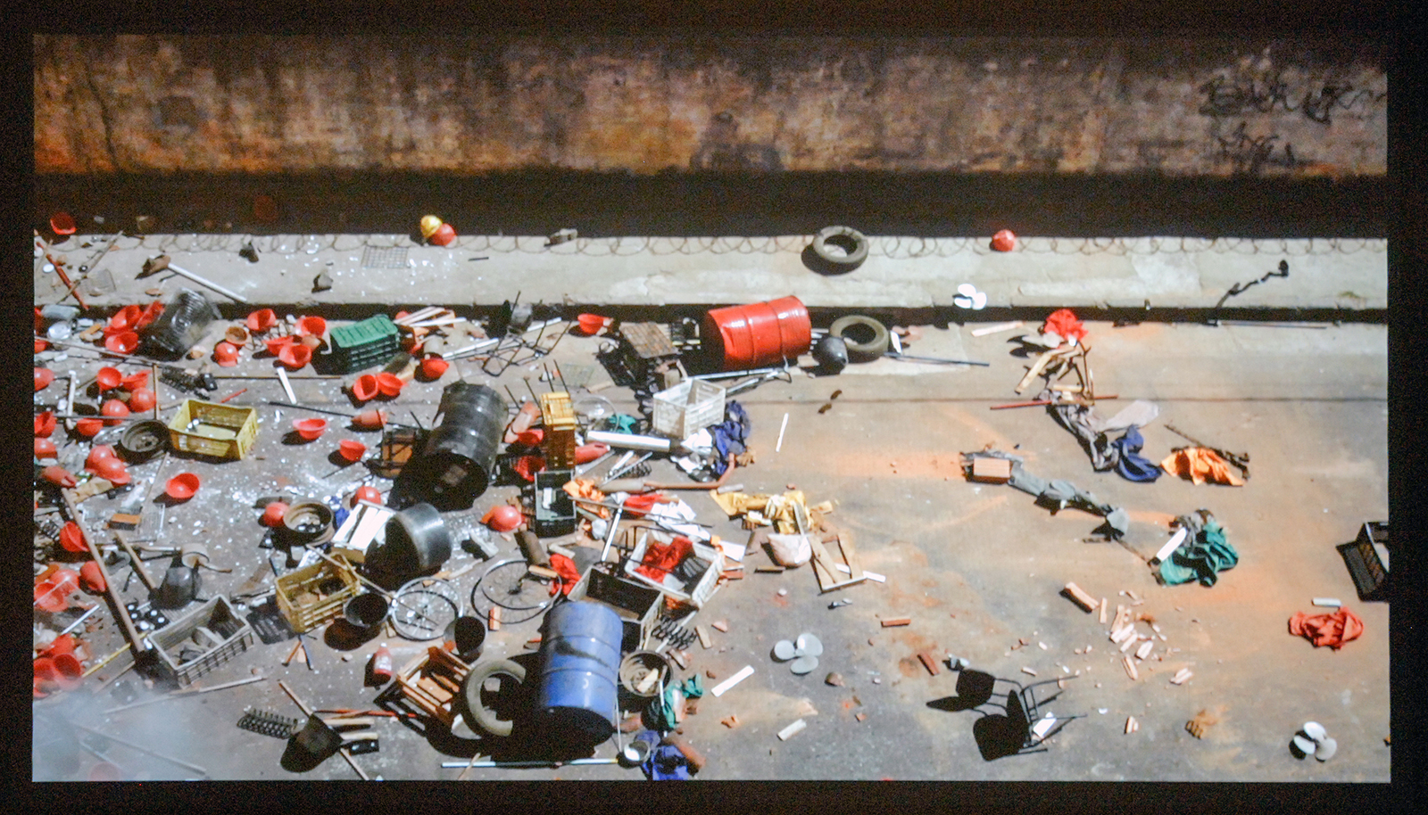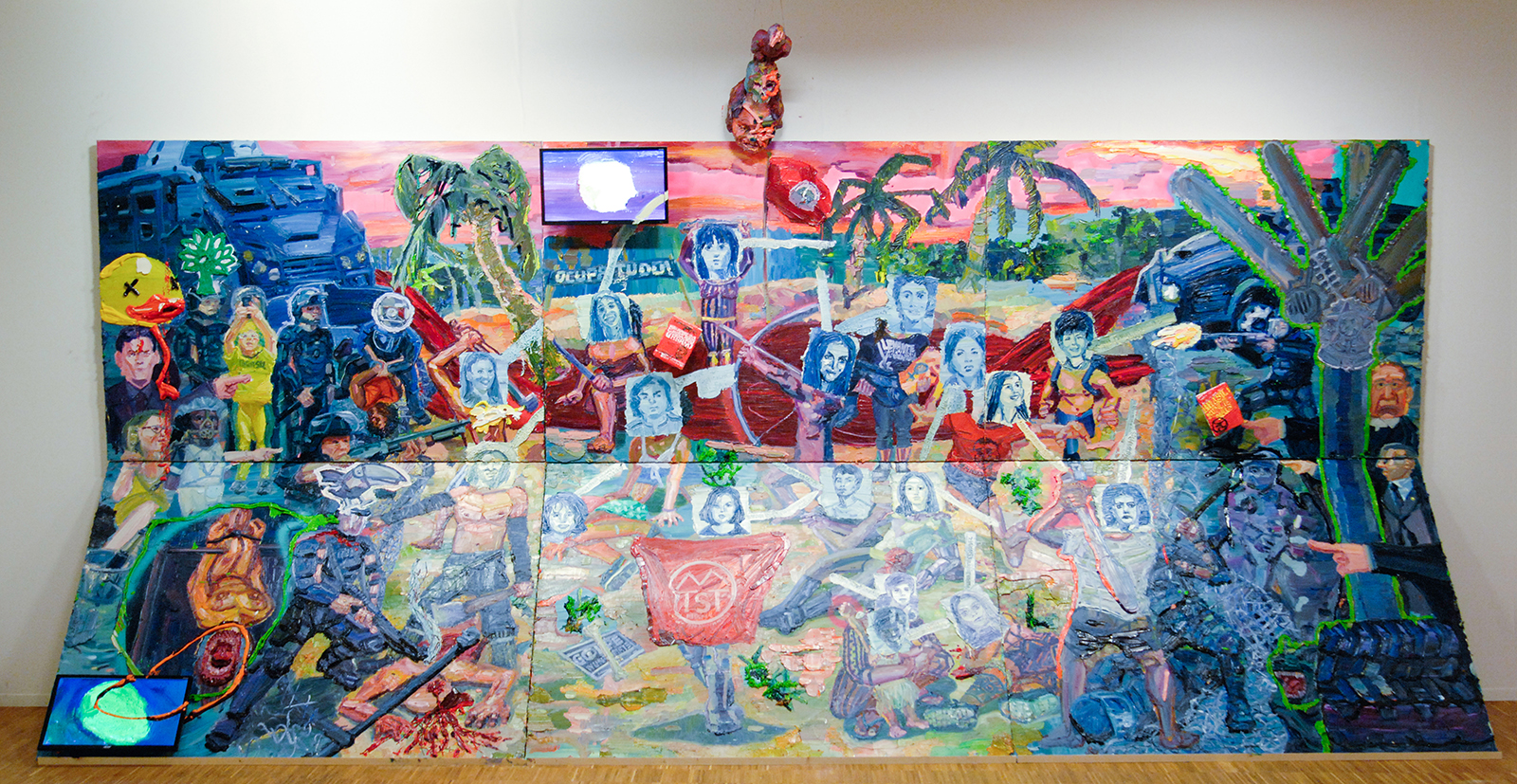 Thiago Martin de Melo – O ova da serpente e o crepusculo da demofobia (The Serpent’s Egg and the Twilight of Demophobia) – Olieverf op canvas, glasvezel sculpturen en tv monitoren met stop motion animaties (detail)