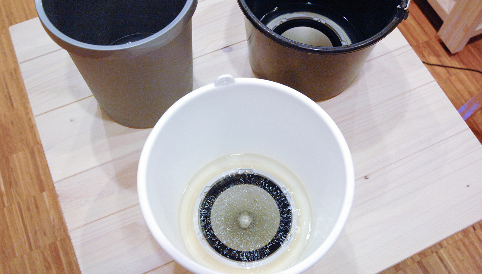 Gisela Motta – Chora Chuva – Installatie met 16 emmers gevult met water met 16 speakers op 6 tafels en 2 banken en 8 stereo versterkers (detail)