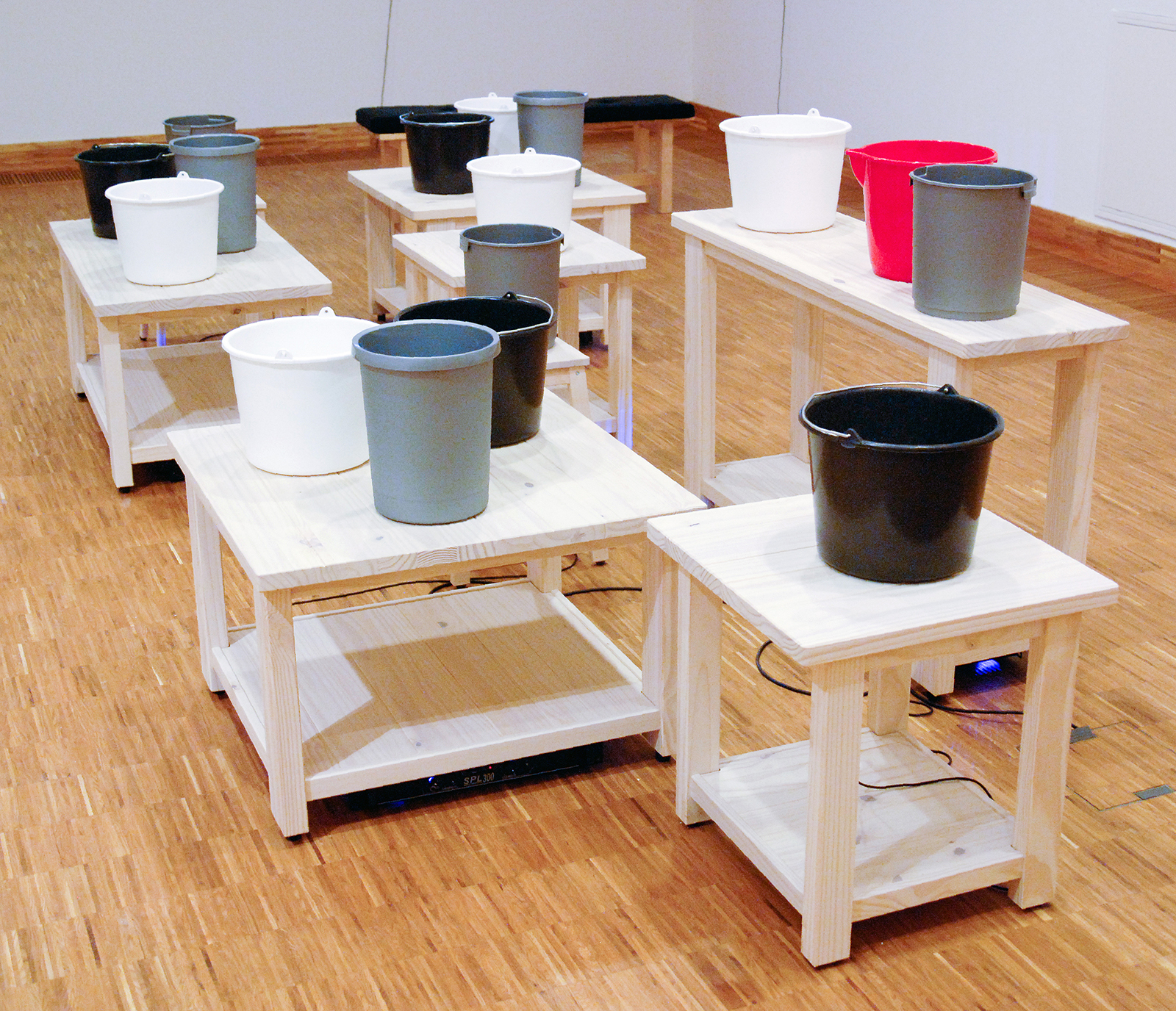 Gisela Motta – Chora Chuva – Installatie met 16 emmers gevult met water met 16 speakers op 6 tafels en 2 banken en 8 stereo versterkers