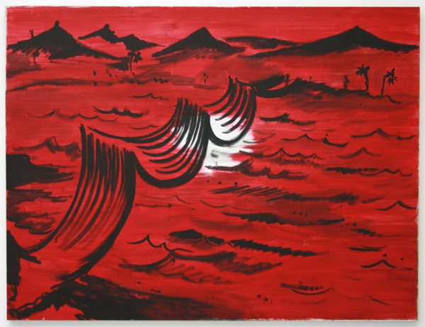 Dit is werk wat (op de foto’s) misschien nog lijkt als typisch abstracte schreeuwende macho schilderen. Toch zijn het heel stille werken die alles behalve macho zijn. De beeldtaal doet dat vermoeden, grote gebaren en felle kleuren. Maar door de gebruikte techniek drinkt de verf in het doek en vloeit langzaam over in de vezels waardoor er een zacht verloop rondom alle streken ontstaat. Hierdoor worden de kleuren en de penseelstreken zacht. Precies daardoor worden het werken die niet schreeuwen, maar heel zachtjes op je schouder tikken en zeggen “kijk naar mij”. Dat is dan ook wat je naar deze werken uitgebreid kunt doen. Hoe eenvoudig ze ook lijken, ze vervelen niet…