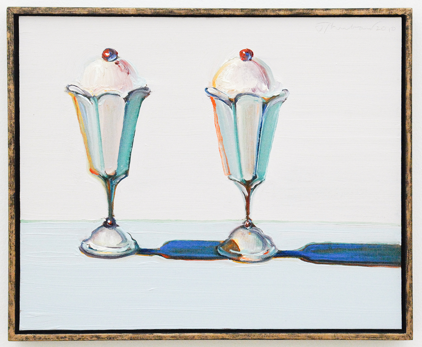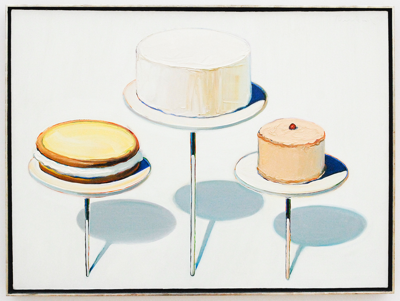 Het overzicht van zijn werk dat nu bij Museum Voorlinden te zien is, is een unicum. Niet eerder zag ik zoveel van zijn werken bij elkaar. Op het eerste gezicht is het misschien een nogal brave tentoonstelling. Laten we wel wezen, het zijn hoofdzakelijk taartjes, ijsjes en snoepjes. Maar ik kan me geen betere schilderijen daarvan indenken dan die van Wayne Thiebaud. Aanrader dus, al zou je dat misschien op het eerste gezicht niet zeggen.