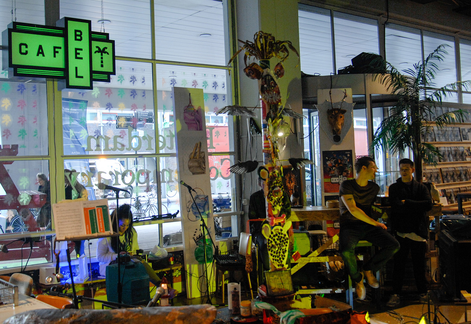 Cafe Bel blijkt helaas de beurs te moeten hebben verlaten. Jammer genoeg dus geen Spinvis op een kunstbeurs, maar nu bij Showroom MAMA (die treed zondag om drie uur op, goede reden om niet naar deze kunstbeurs te gaan maar dus wel naar MAMA).
