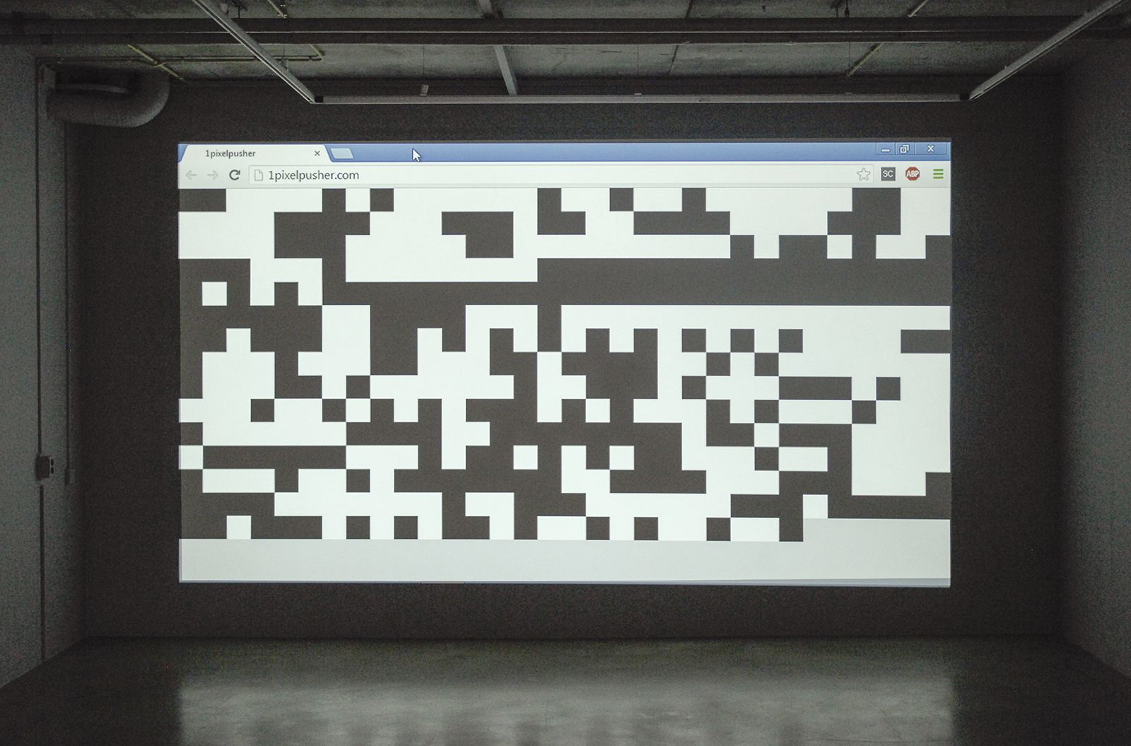 Op het moment dat ik binnenkwam functioneerde helaas maar 1 van de twee werken (dat is toch een nadeel van webkunst, soms zit er een bug in). Met een telefoon kun je een zwarte of witte pixel toevoegen door de telefoon ineens van je af te duwen. Op de website 1pixelpusher.com zie je dan vervolgens aan de rechterzijde een pixel toegevoegd worden.