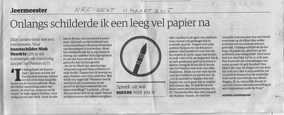 Nu mag dat alles deprimerend klinken maar Peeters blijft vooral spelen. Het is een melancholisch spel, maar het blijft een spel waar het plezier altijd om de hoek komt kijken. Met taal en beeld geeft hij het werk maar daardoor ook zichzelf steeds een positie ten aanzien van de wereld om zichzelf heen. Het zijn kwaliteiten in het werk die nu, ook nu Sef Peeters er zelf niet meer bij is, blijvend relevant maken.