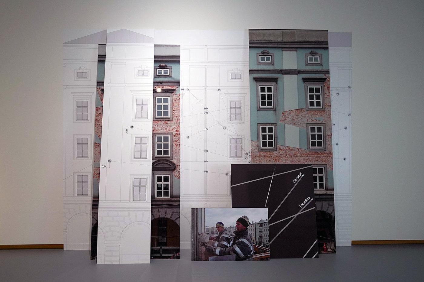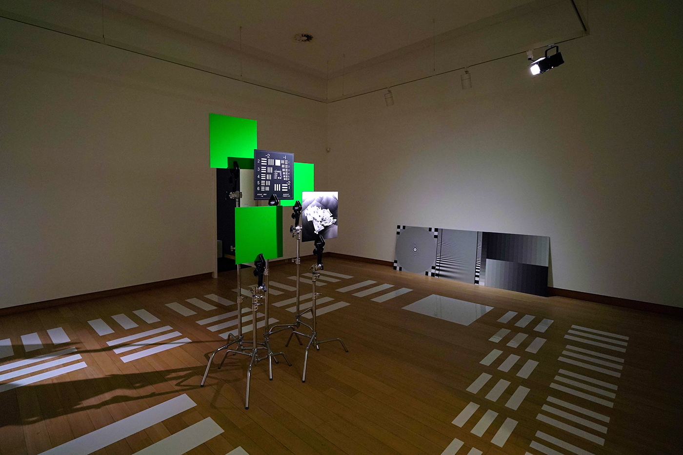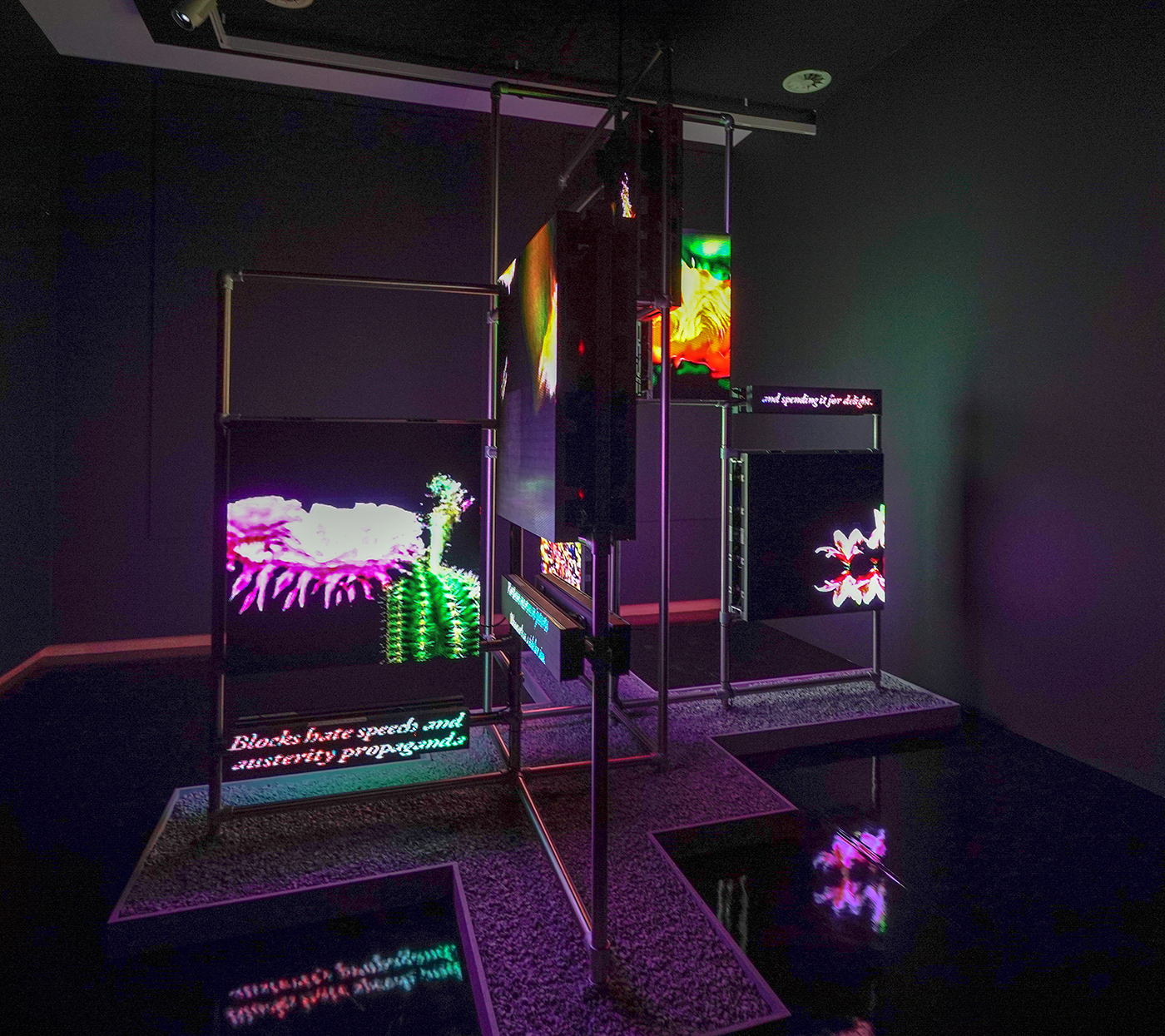 Hito Steyerl – Power Plants – Roestvrijstalen steigerconstructies, LED-panelen, scrollende LED tekstpanelen, gecementeerde MDF dozen, Olivijn grind, vinyl, meerkanaals videoloop, kleur en zonder geluid