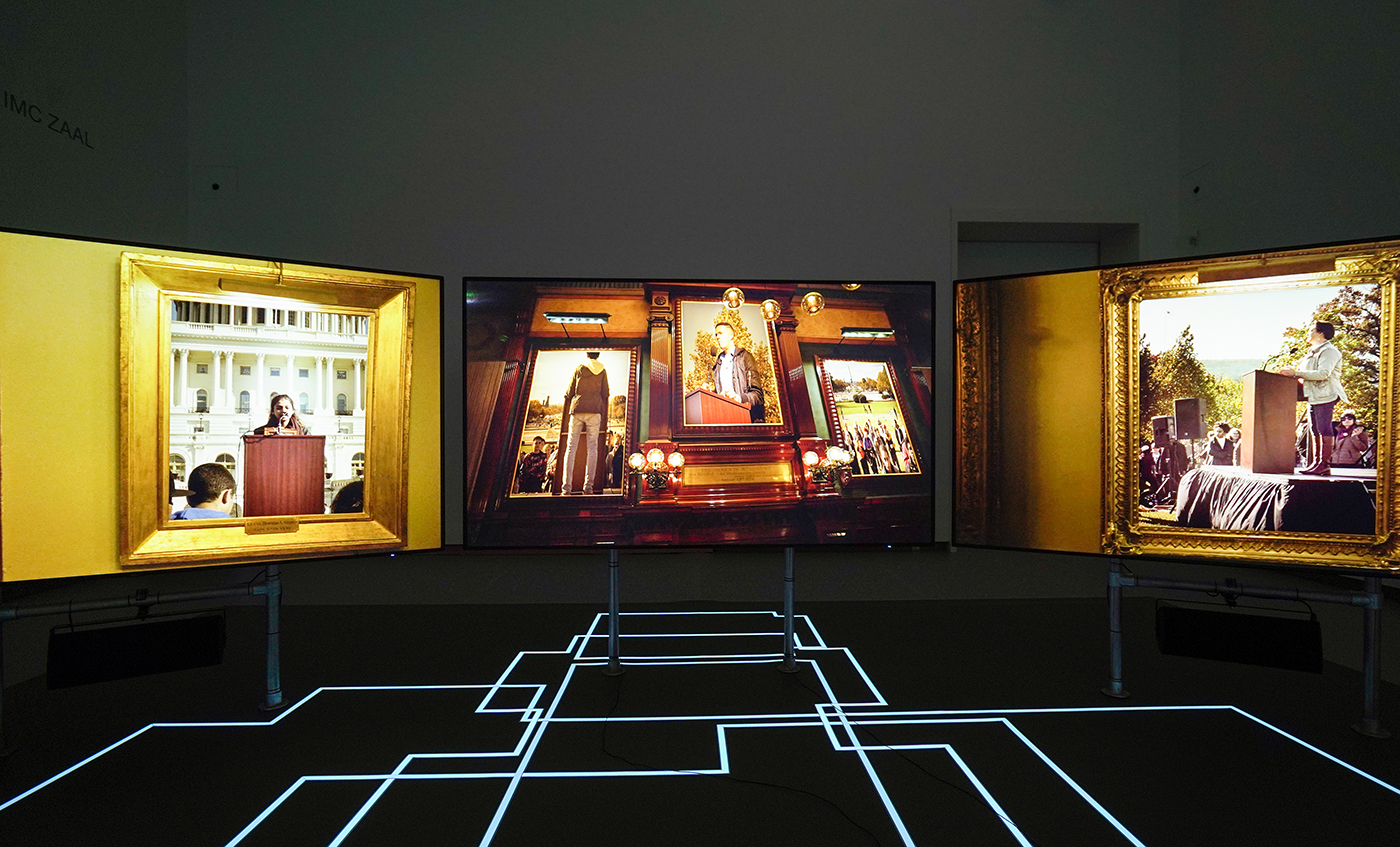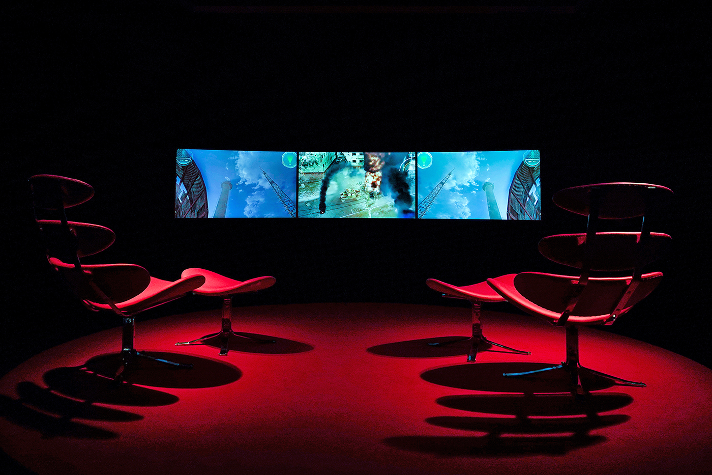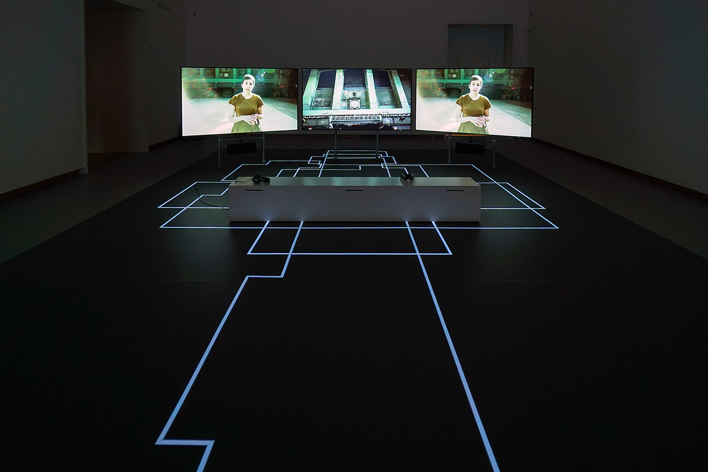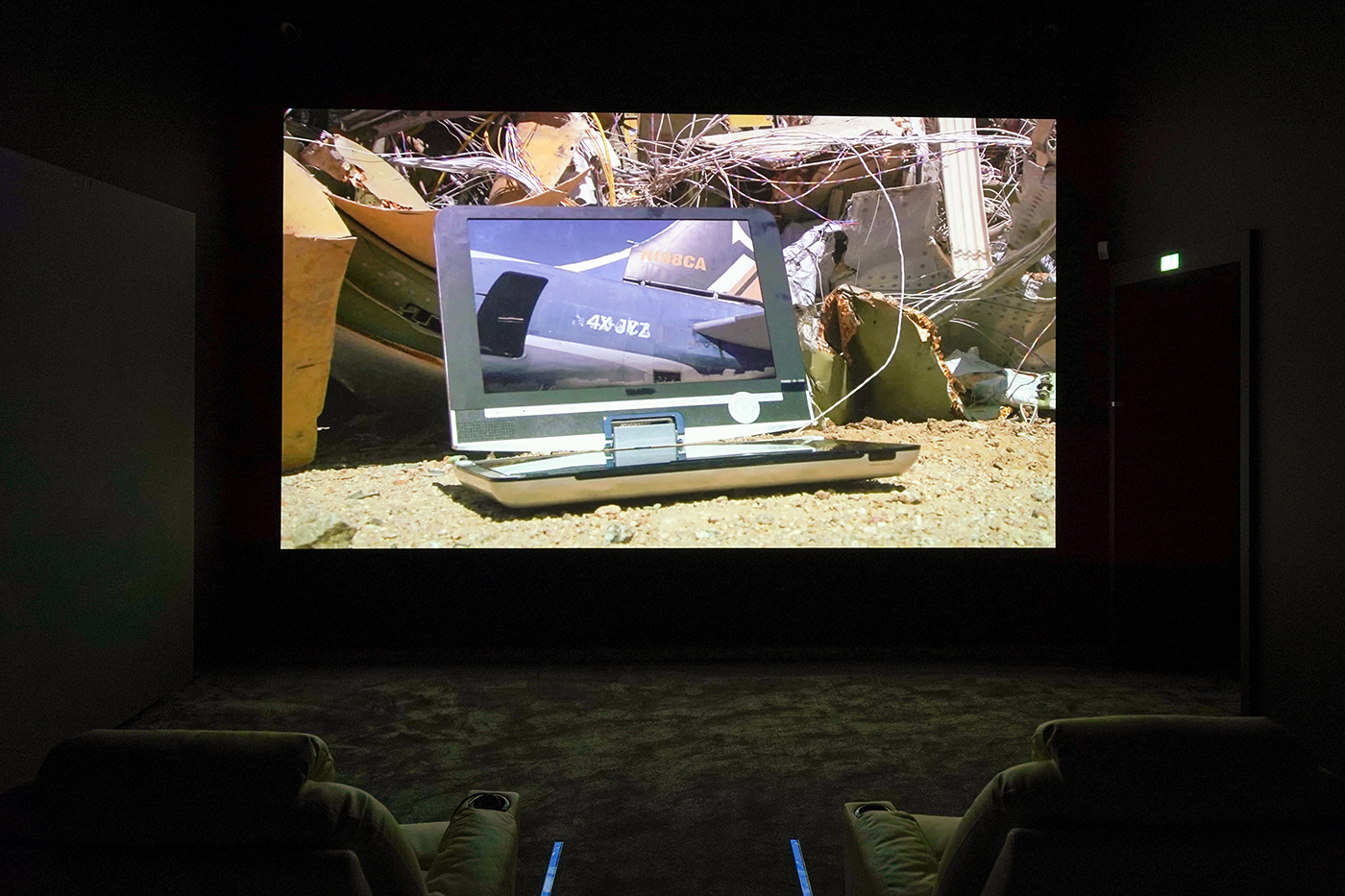 Hito Steyerl – Mission Accomplished, Belanciege – Driekanaals HD-video-installatie met omgevingssculptuur, kleur en geluid, 47,23minuten, 2019