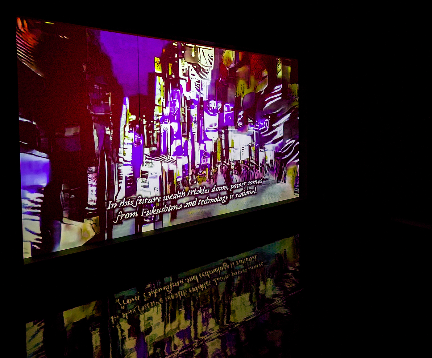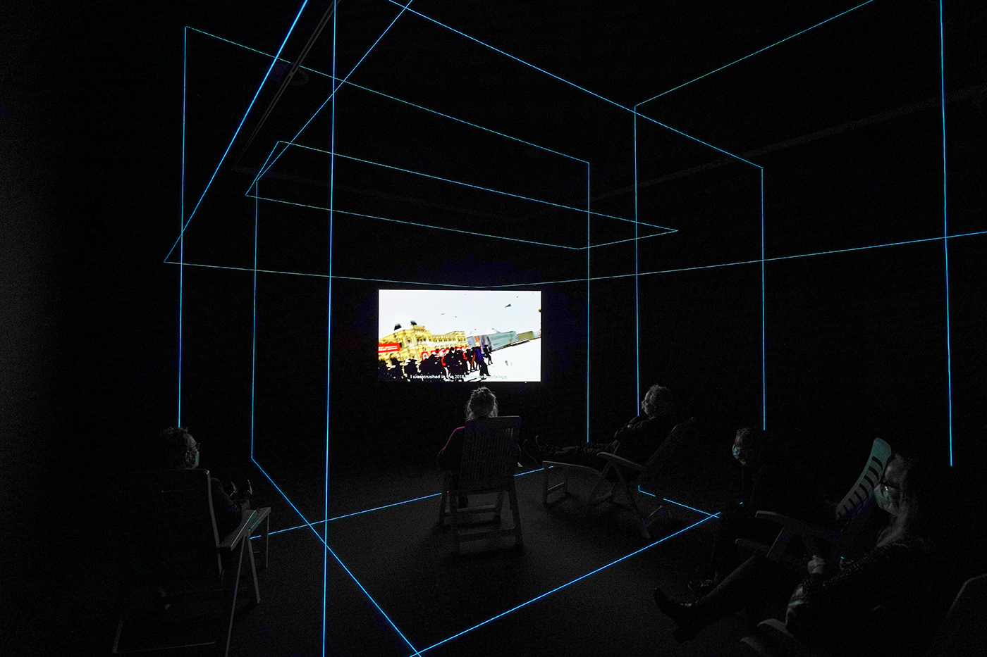 Hito Steyerl – This is the Future – Eenkanaals HD-video-installatie met omgevingssculptuur, kleur en geluid, 16 minuten, 2019