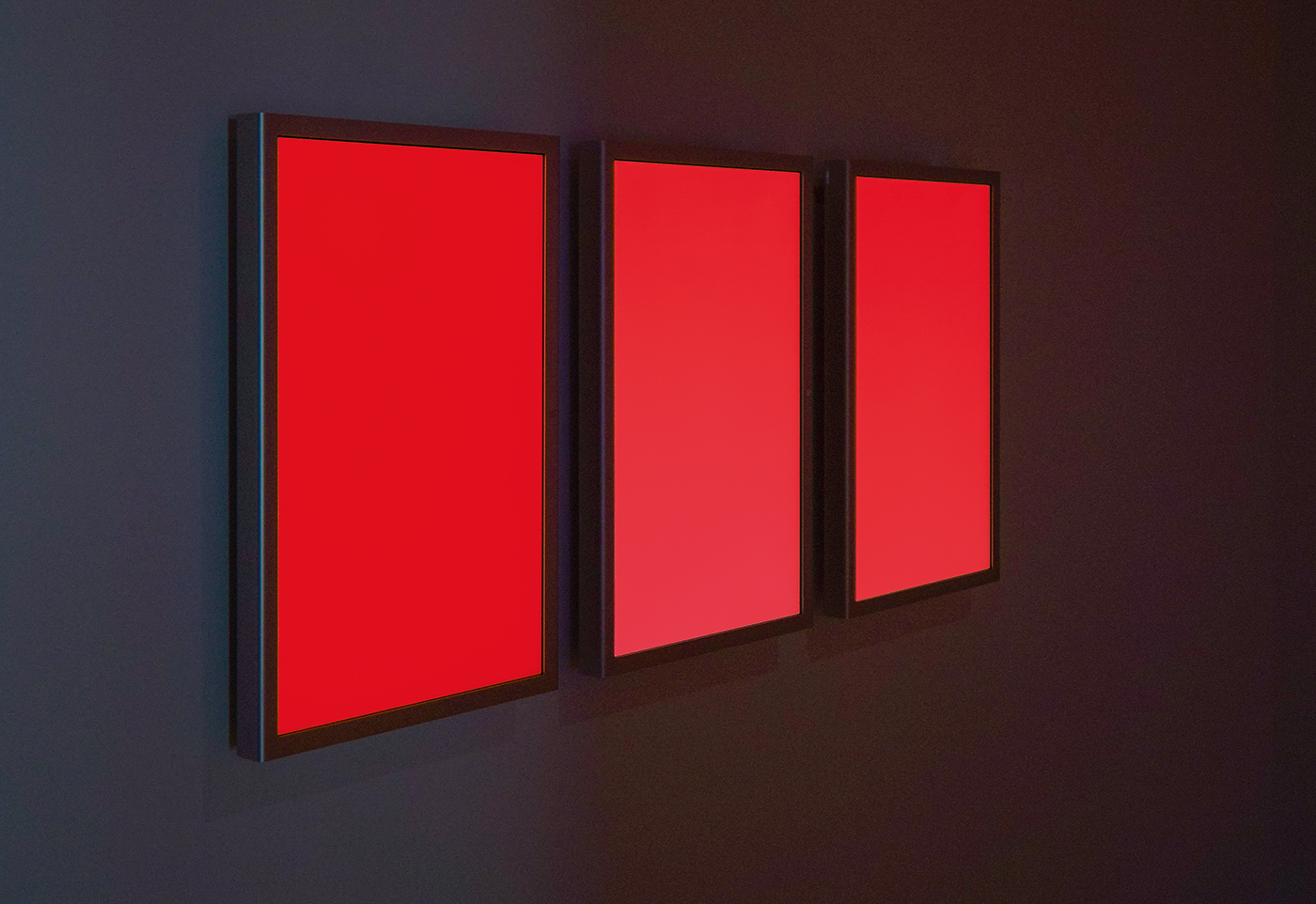 Hito Steyerl – Red Alert – Drieluik van 30-inch Apple HD cinema displays, video, kleur, zonder geluid, 30seconden, 2007