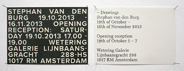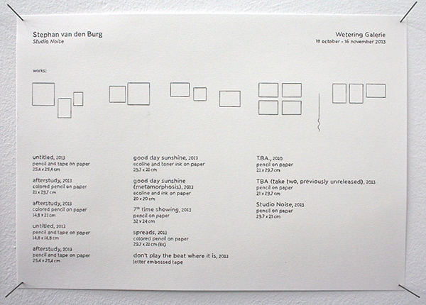 Het werk van Stephan van den Burg heeft meerdere gelaagdheden. De eerste overduidelijk is het zelfrefererende aspect. Hij kopieert delen van zijn eigen werk en verwijst naar bijvoorbeeld zijn tentoonstelling. Zo maakt hij tentoonstelling overzichten waarop de titels staan. Ook de uitnodiging is tevens een werk. Dan kopieerd hij door middel van een eenvoudig en doeltreffend systeem met plakband zijn werk in zichzelf.